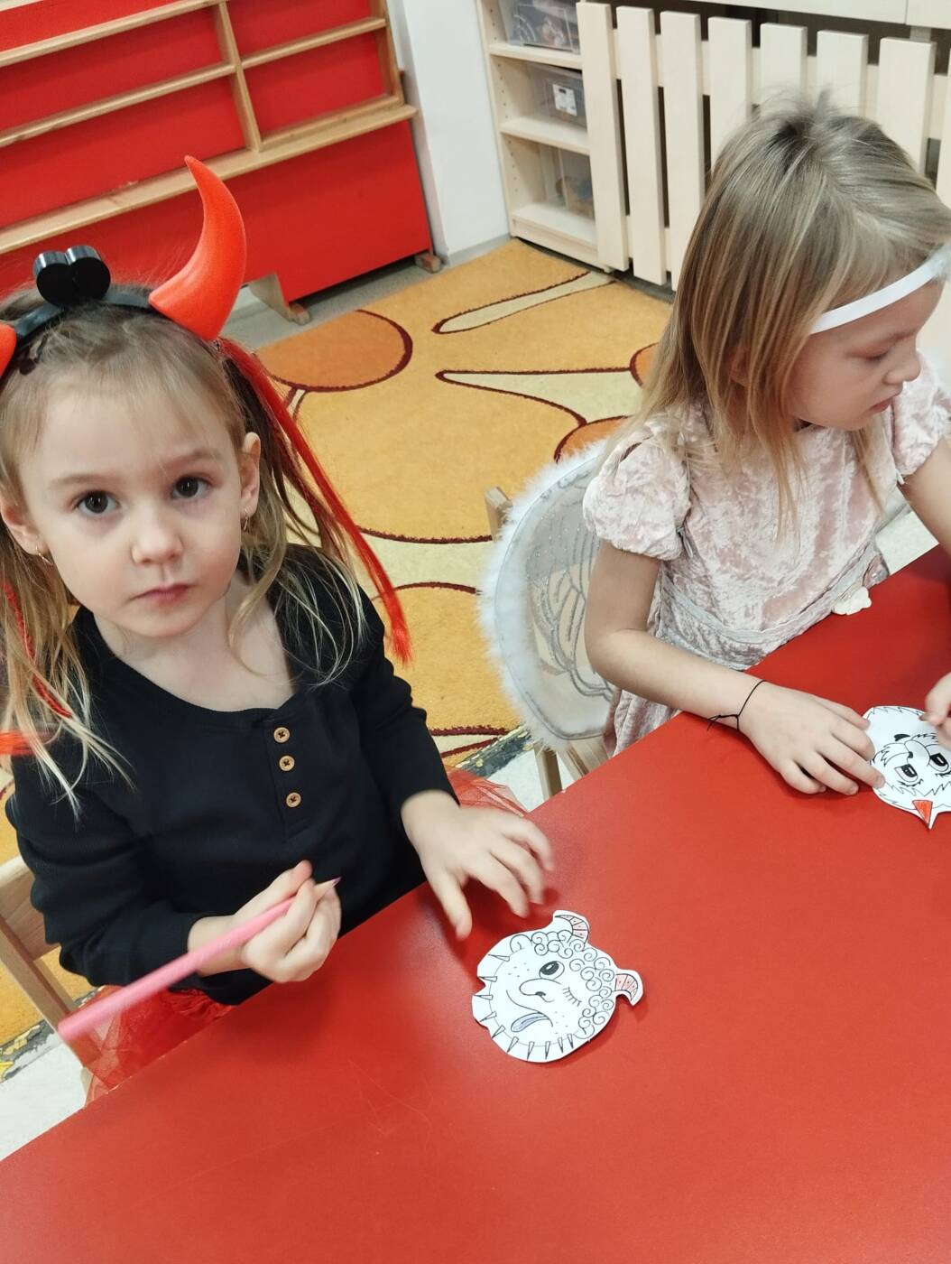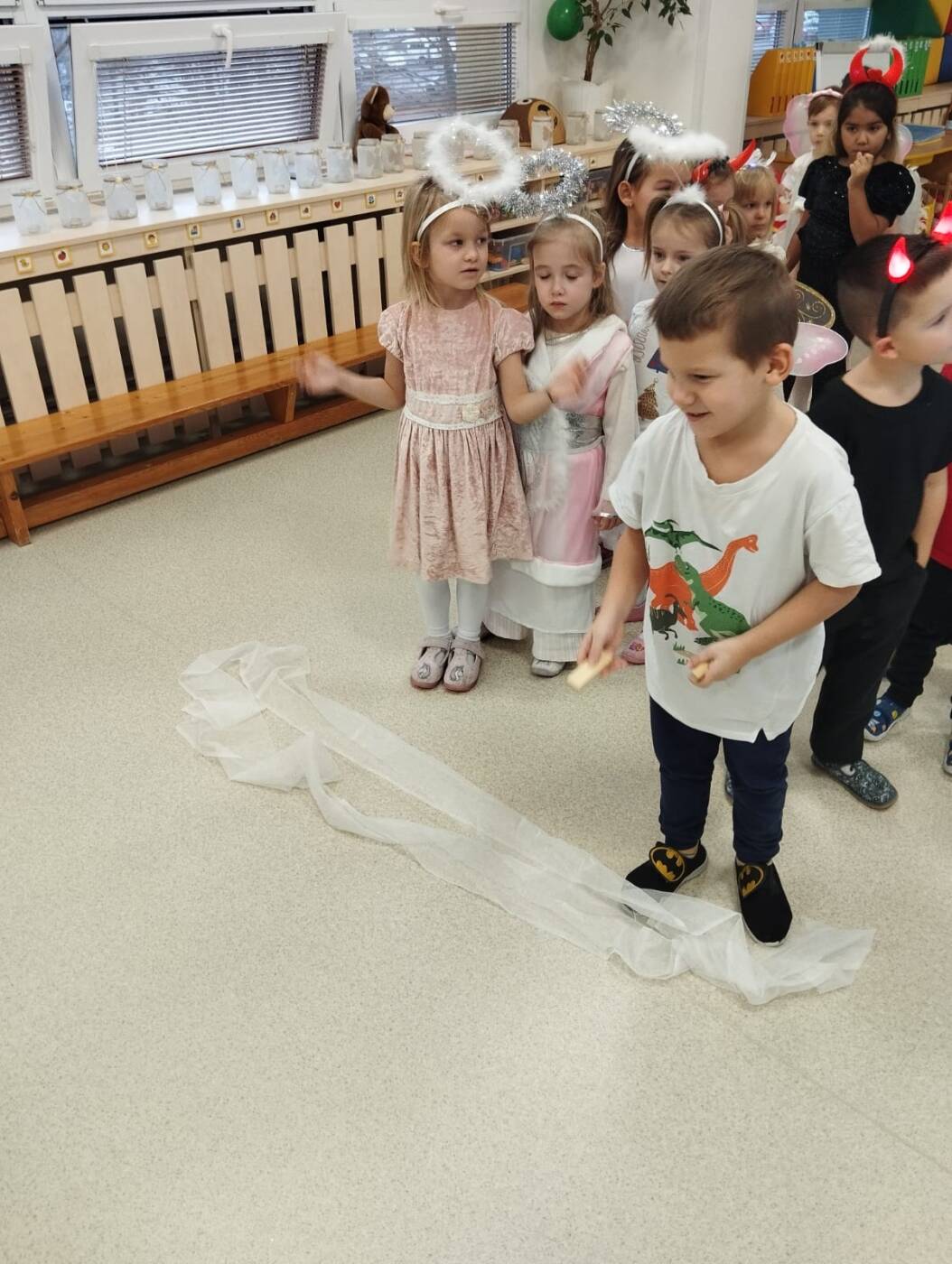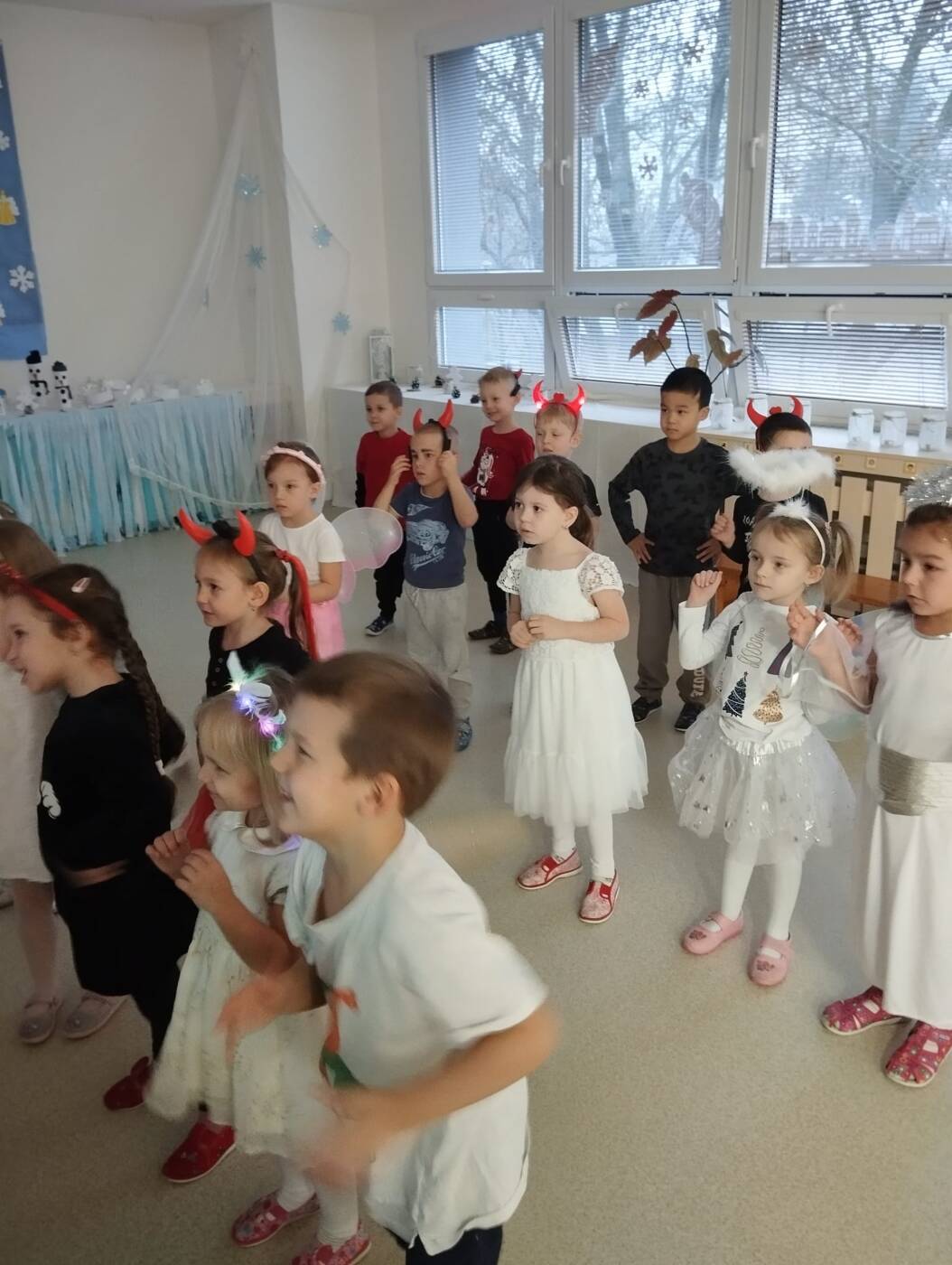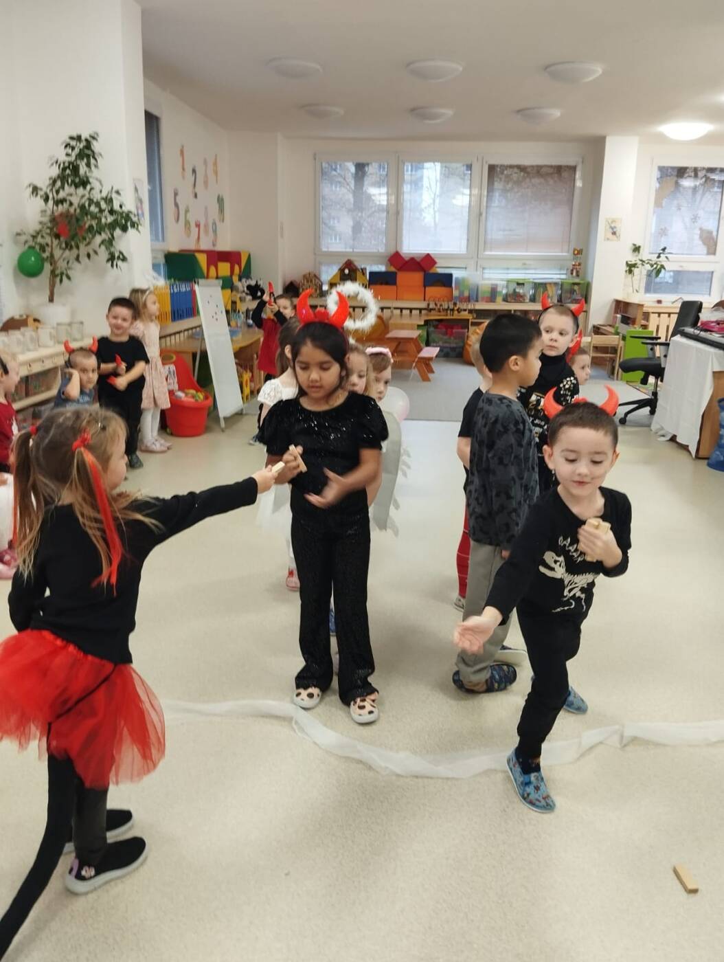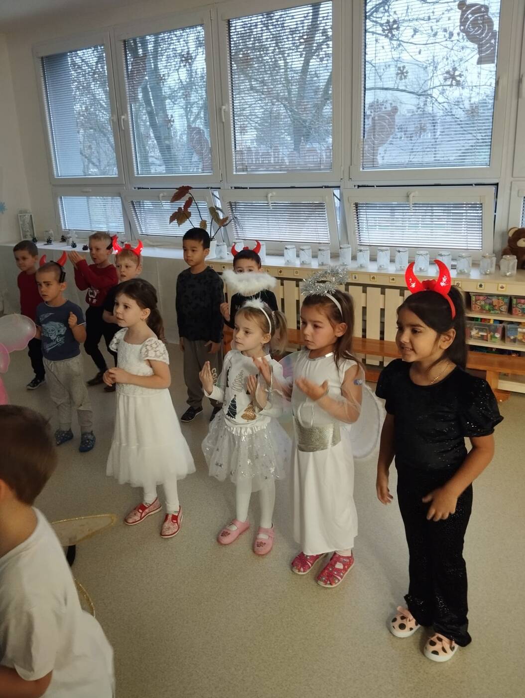 V pátek přišly děti v kostýmech čertů a andělů a nemohly se dočkat, až začne mikulášské dopoledne plné zábavy a her. Kluci a holky si vyrobily zápich ,,Čertíka“, vyzkoušely si hod na cíl při ,,Přikládání polínek do kotle“, vybarvily si omalovánky a vesele si zatančily na Čertí diskotéce. Nadšeně přivítaly Mikuláše a jeho společníky a zazpívaly jim písničku ,,Mik, miku, Mikuláš“. Po nadílce si děti poslechly pohádku ,, Čert a Káča“.