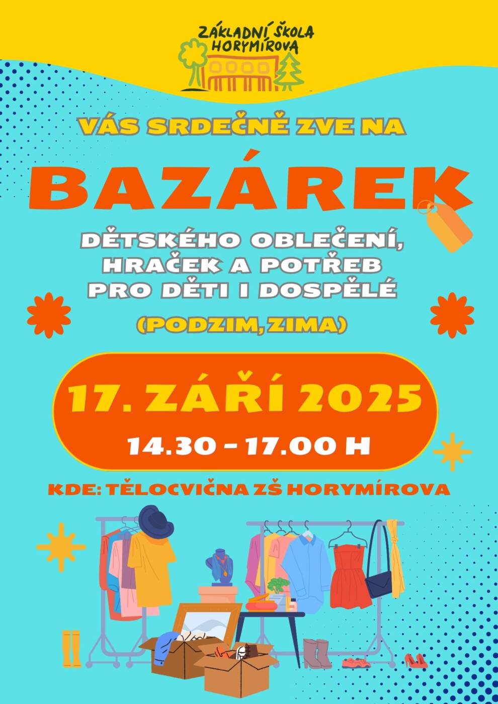 Akce se uskuteční ve středu 17. září 2025 od 14:30 do 17:00 hodin v prostorách tělocvičny ZŠ Horymírova (boční vchod od družiny bude otevřen od 14:00 pro přípravu prodejců).