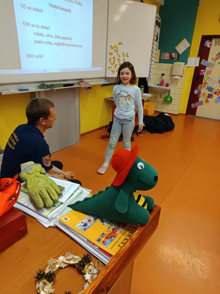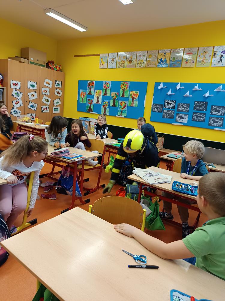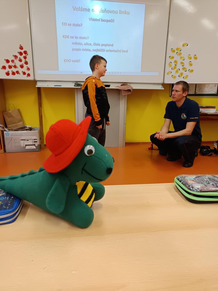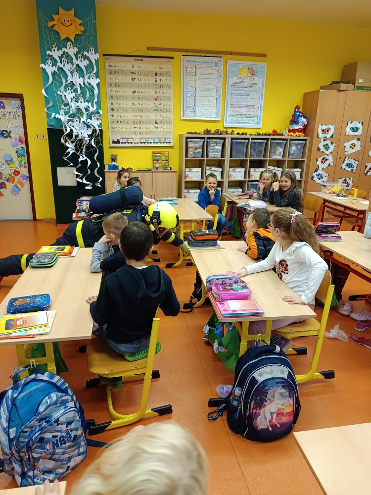 Dnes nás navštívil pan hasič. Společně jsme přišli na to, že úkolem hasičů není jen hasit požár, ale že je jich zapotřebí i při jiných akcích – povodně, havárie atd. Zachránil naši Elišku a poradil nám, jak přivolat pomoc.