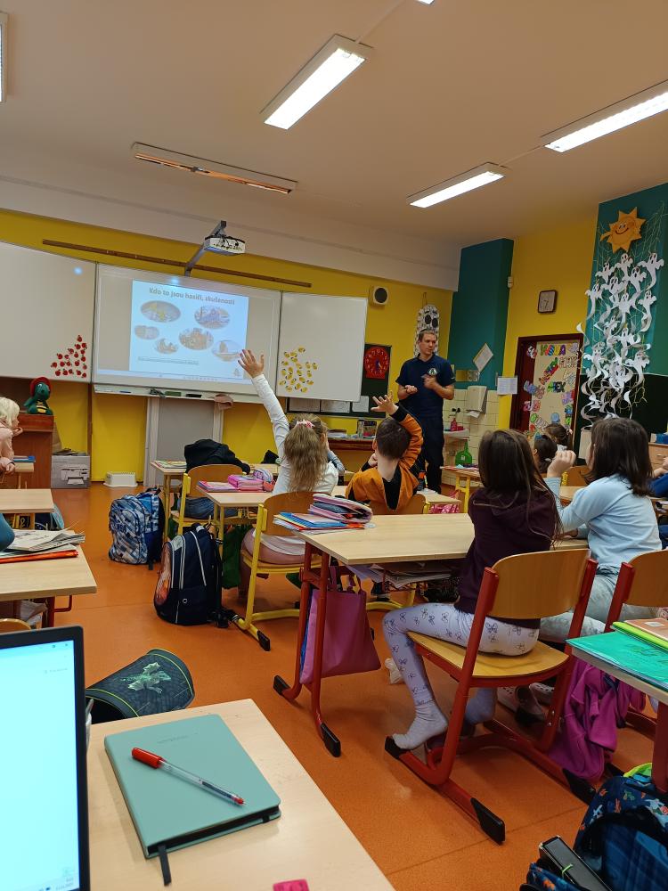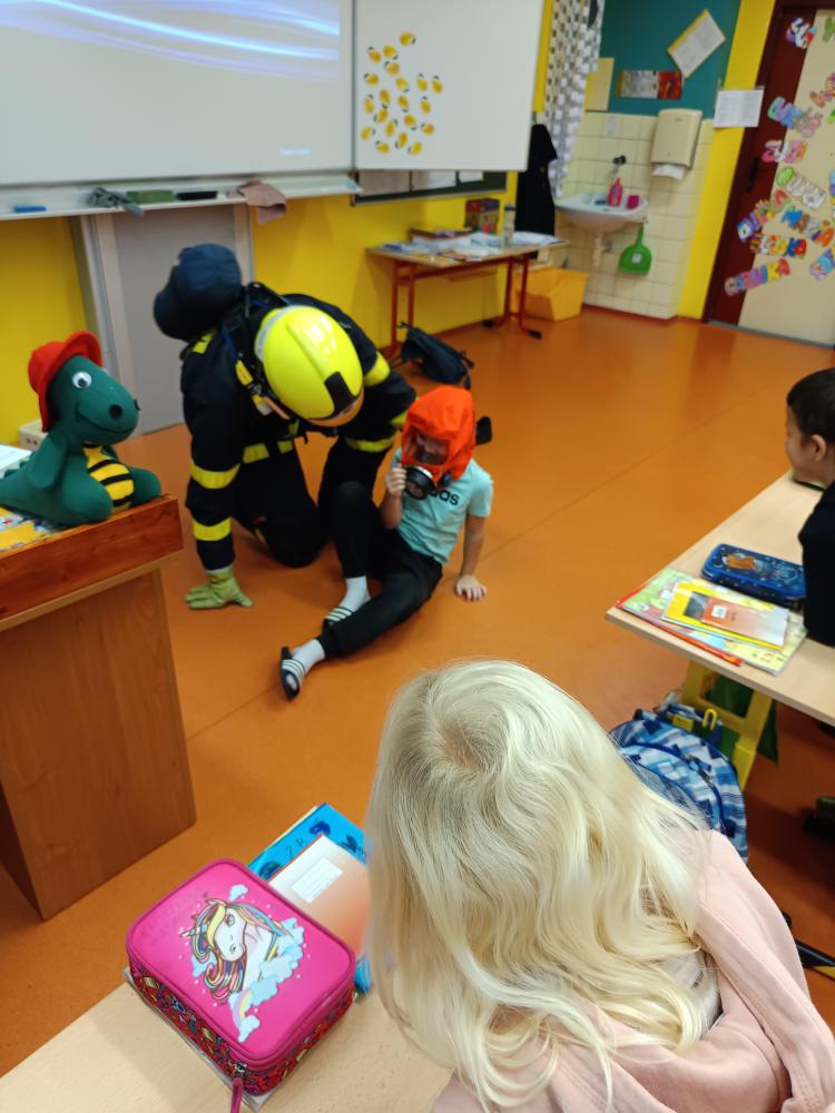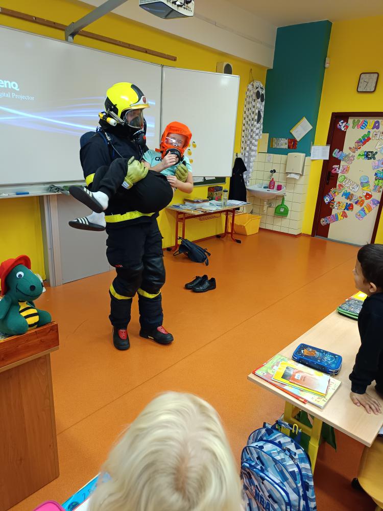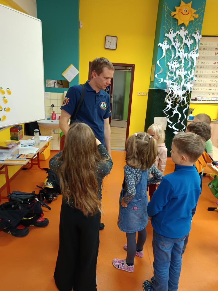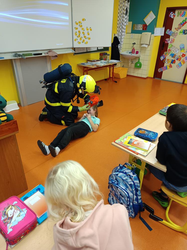 Dnes nás navštívil pan hasič. Společně jsme přišli na to, že úkolem hasičů není jen hasit požár, ale že je jich zapotřebí i při jiných akcích – povodně, havárie atd. Zachránil naši Elišku a poradil nám, jak přivolat pomoc.