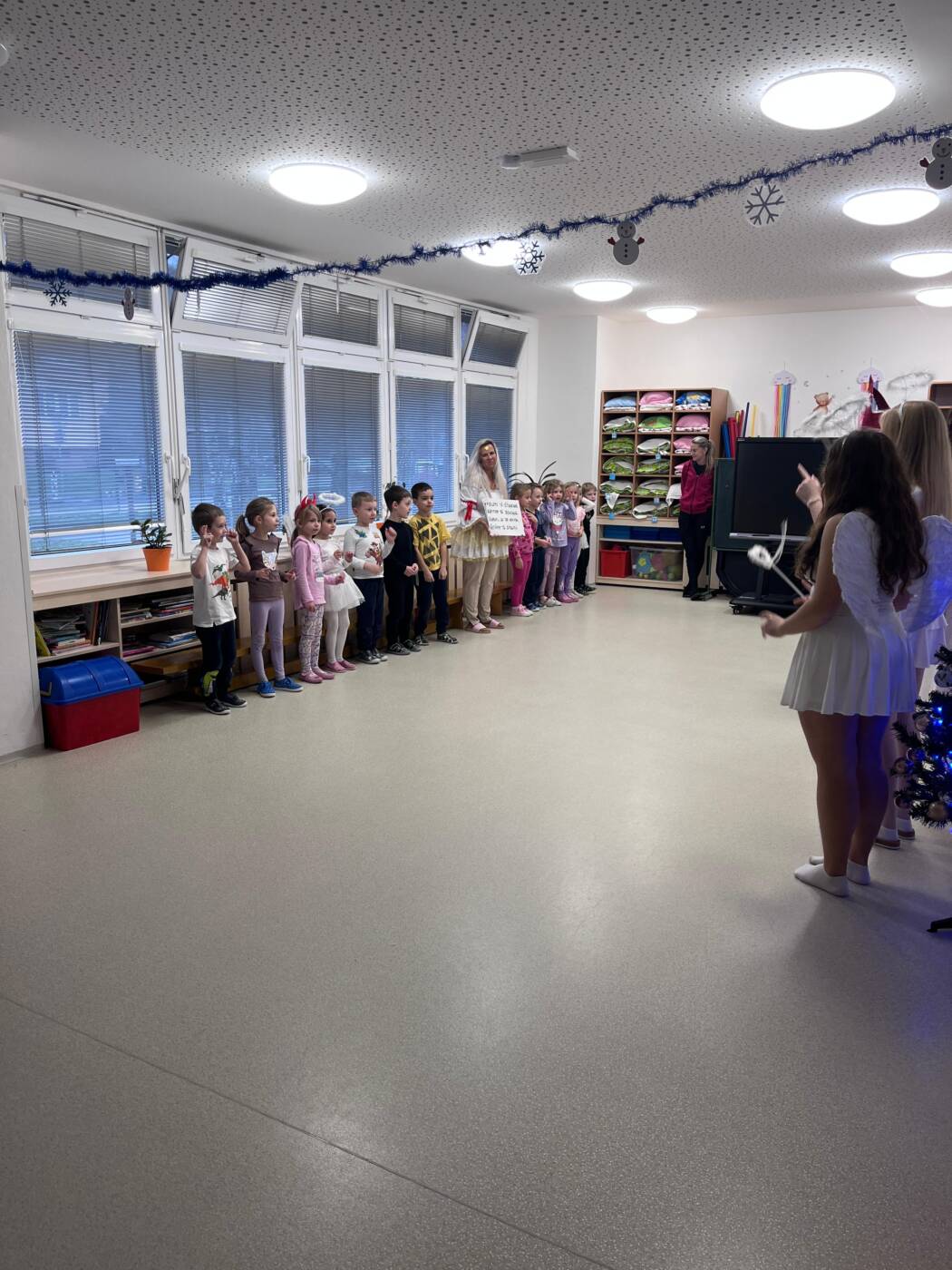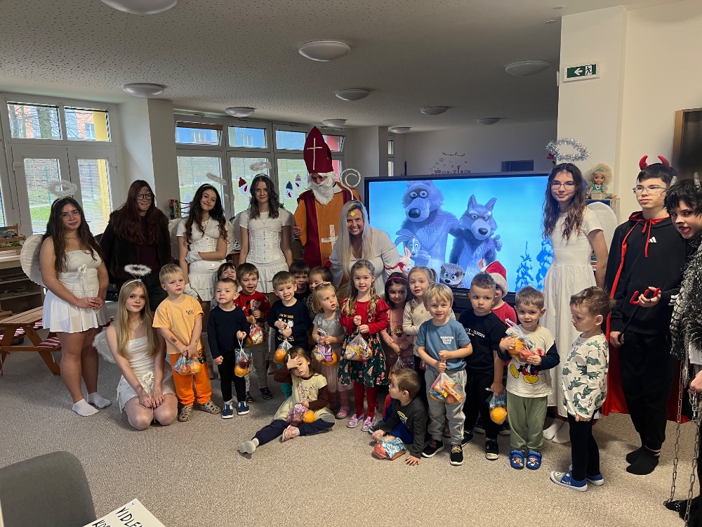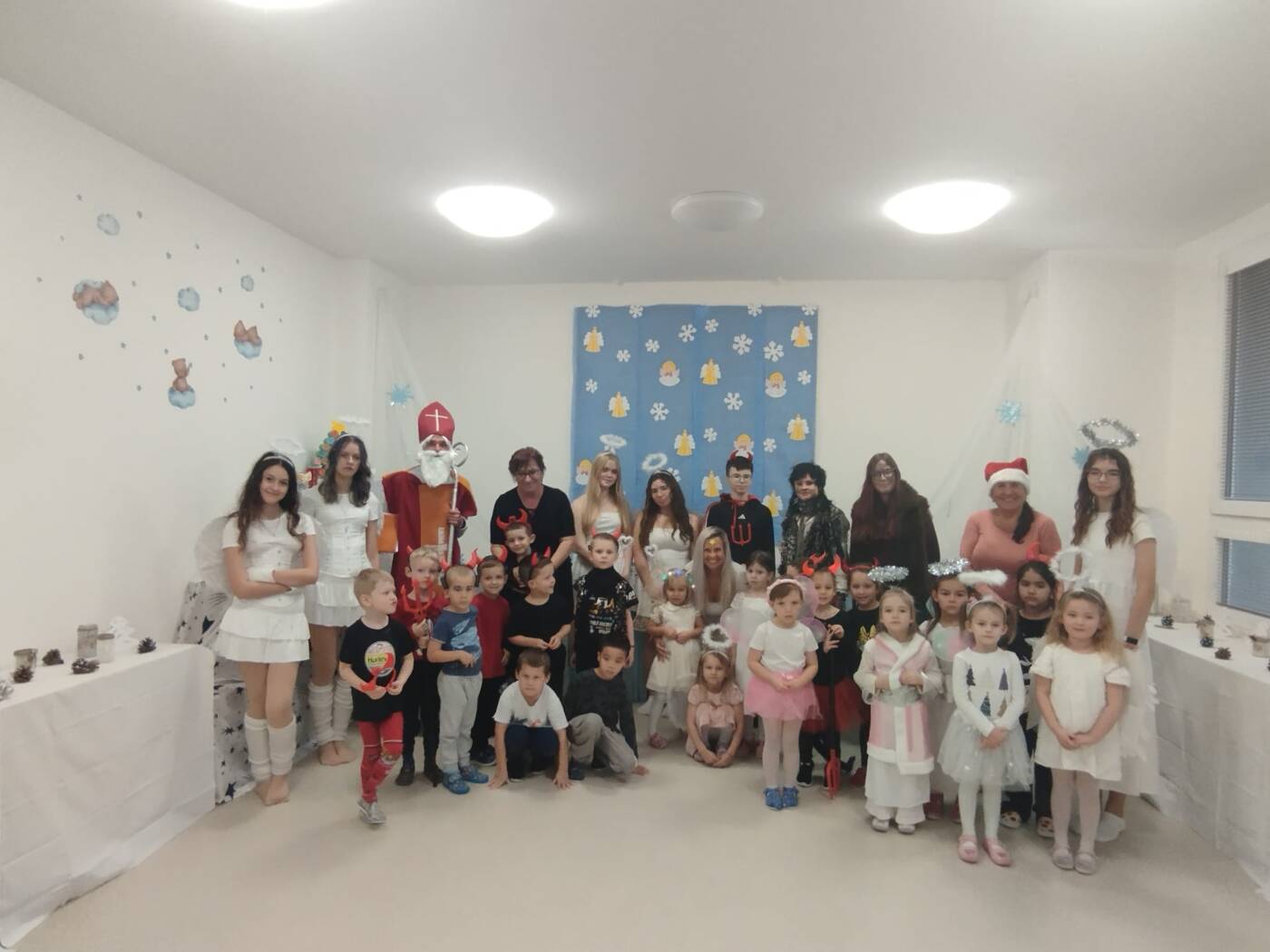 Na oplátku děti předvedly, co si připravily – zazpívaly krátké písničky a zarecitovaly říkanky, které se ve školce s nadšením naučily. Mikulášská družina jejich pěkné vystoupení ocenila pochvalou a na závěr obdarovala všechny děti drobnými dárečky.