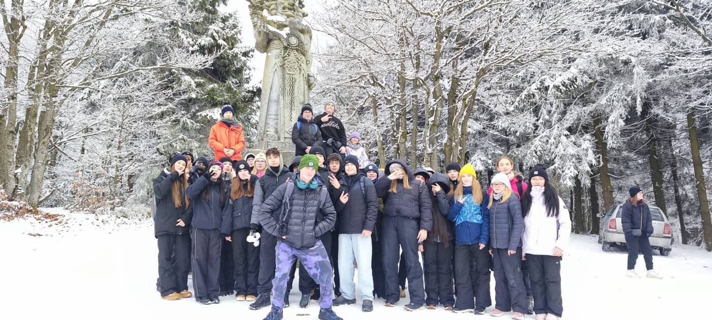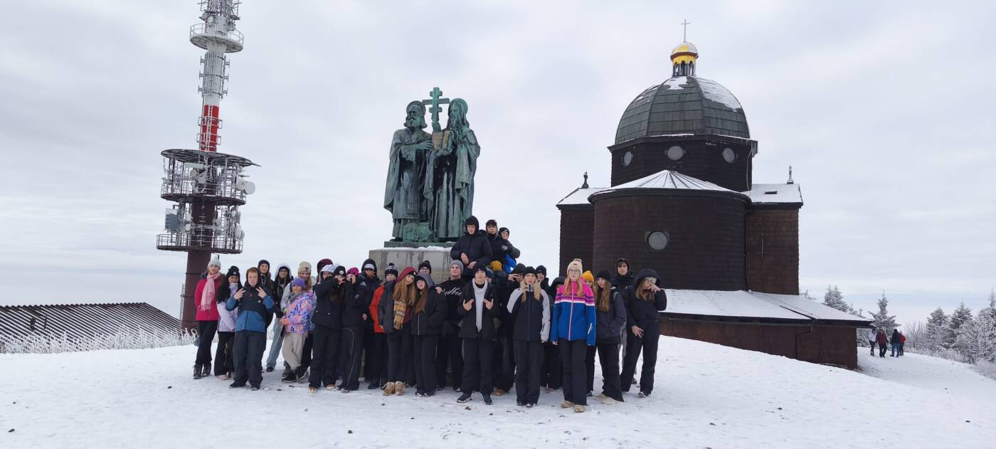 Když pak polední zvon k tabuli svolal a všichni se vydatným pokrmem posilnili, vydala se omladina k malebným vrcholkům Beskydským. Kroky jejich nejprve na Pustevny zamířily, kde stanuli v úžasu nad stavbami podivuhodnými, jež barvami i důmyslnou řezbou v krajině září. Odtud pak, spoléhajíce na sílu nohou svých, po hřebeni k hoře Radhošti putovali. Uctivě minuli modlu Radegasta, boha starých Slovanů, až k samotnému temeni hory dokráčeli, kde kaple svatých soluňských bratří k nebesům vzhlíží.
