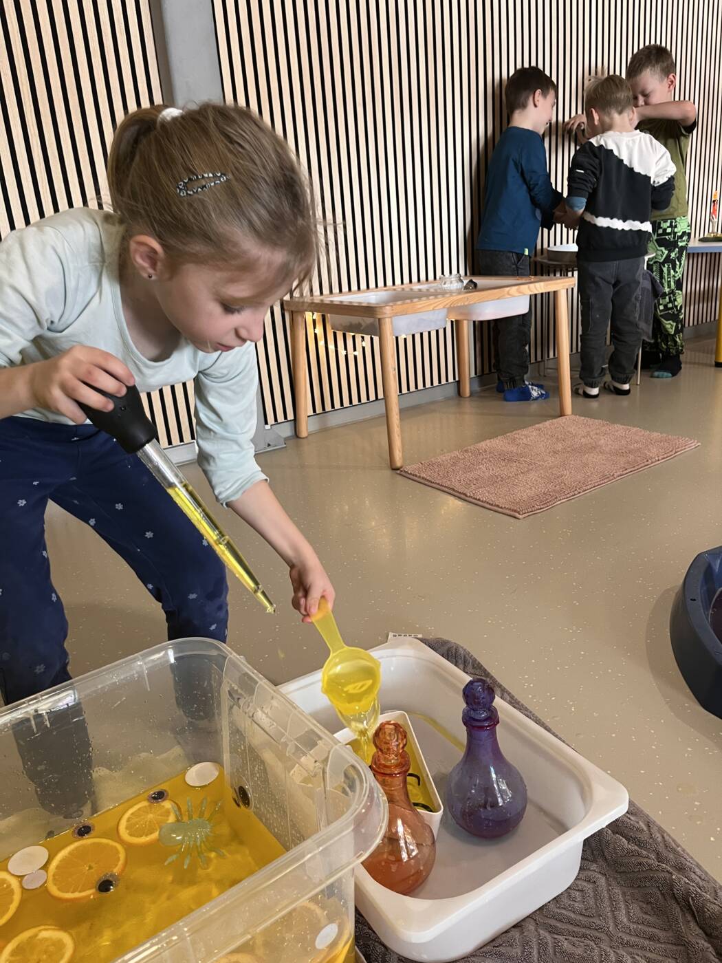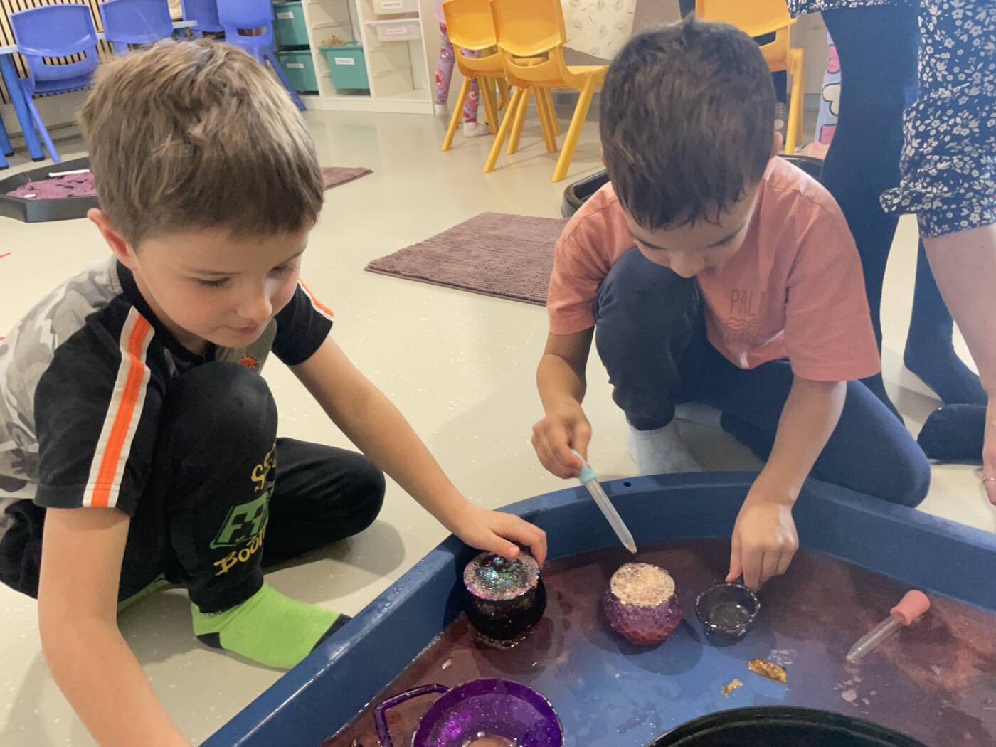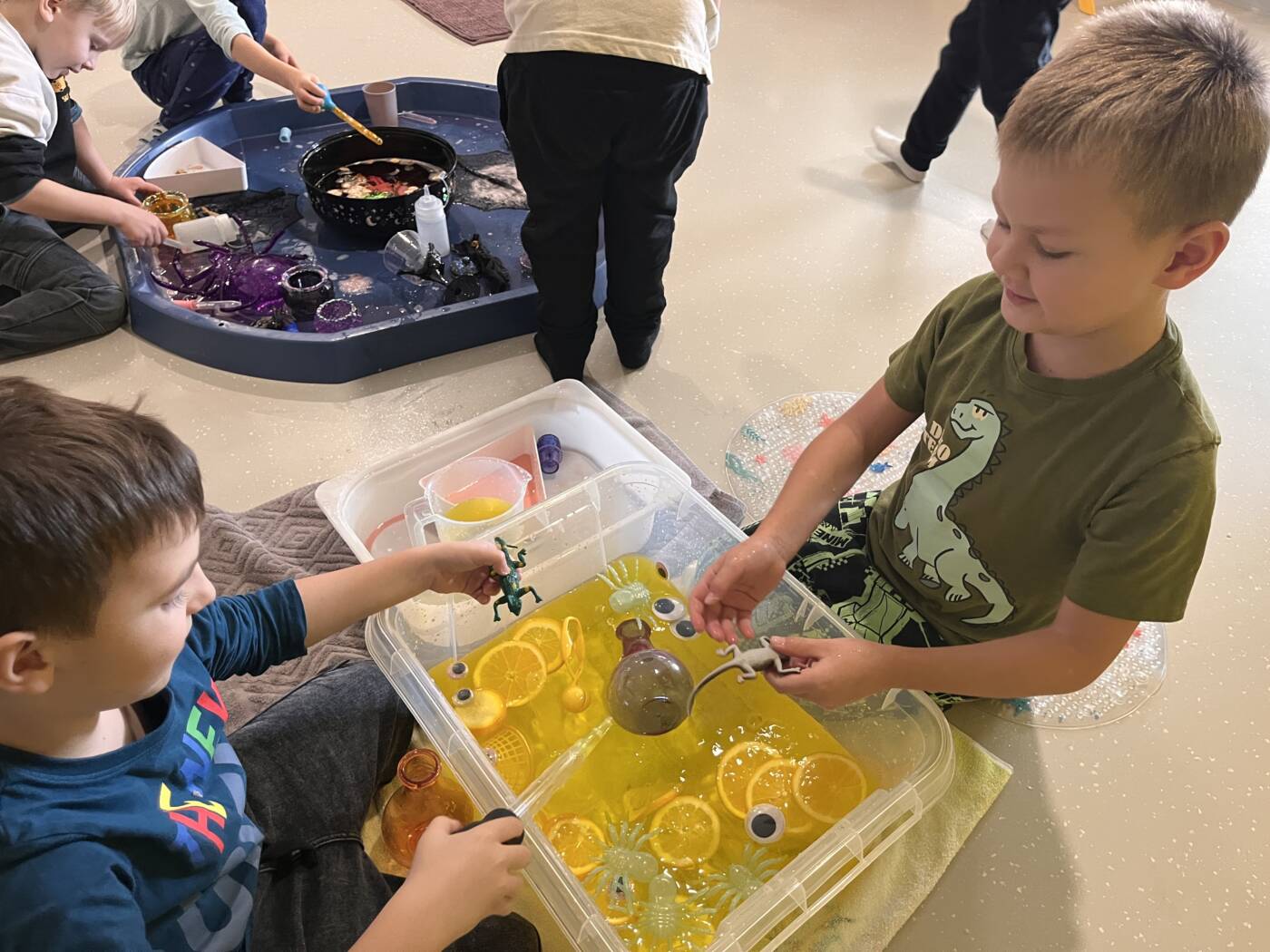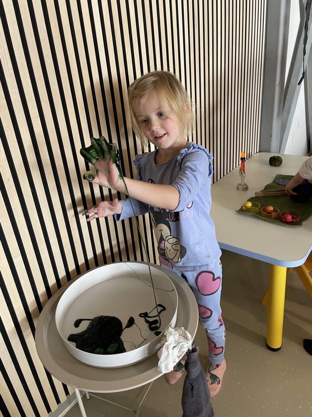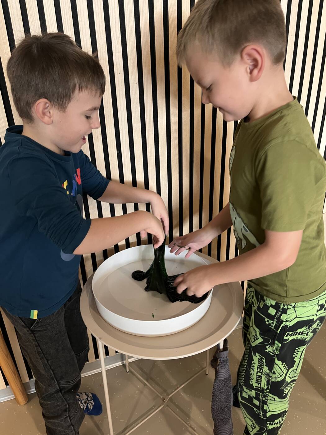 Potom začala pravá patlací zábava! Děti vytvářely čarodějnické lektvary, tvořily netopýry, malovaly halloweenské obrázky a hrály si se slizem, který je moc bavil.
