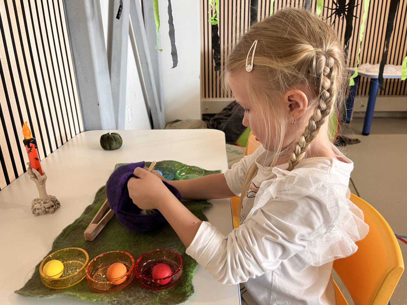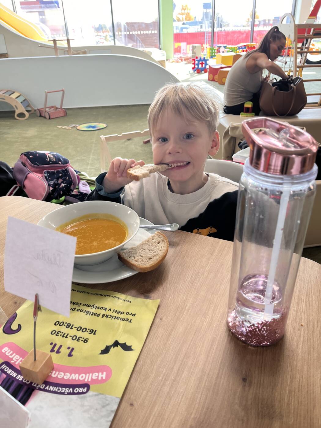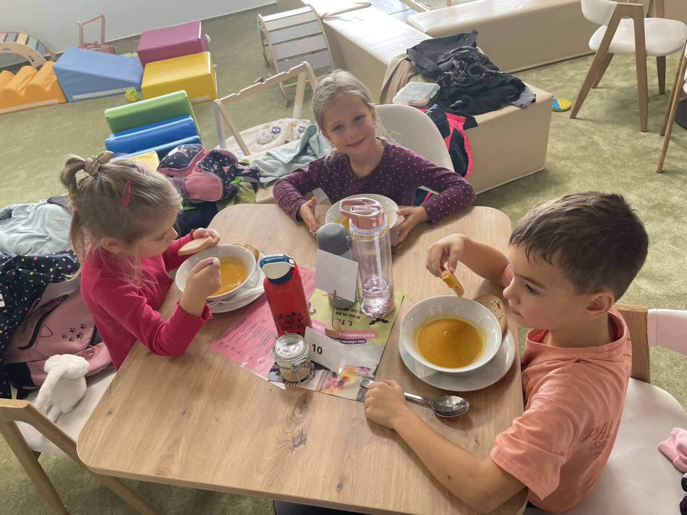Na závěr si pohrály v krásné herně s Montessori hračkami, kde objevovaly nové hry a vyzkoušely si různé pomůcky. Den završila lahodná dýňová polévka, která všem moc chutnala.
