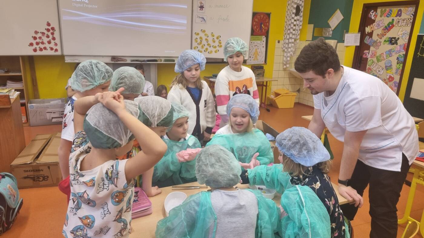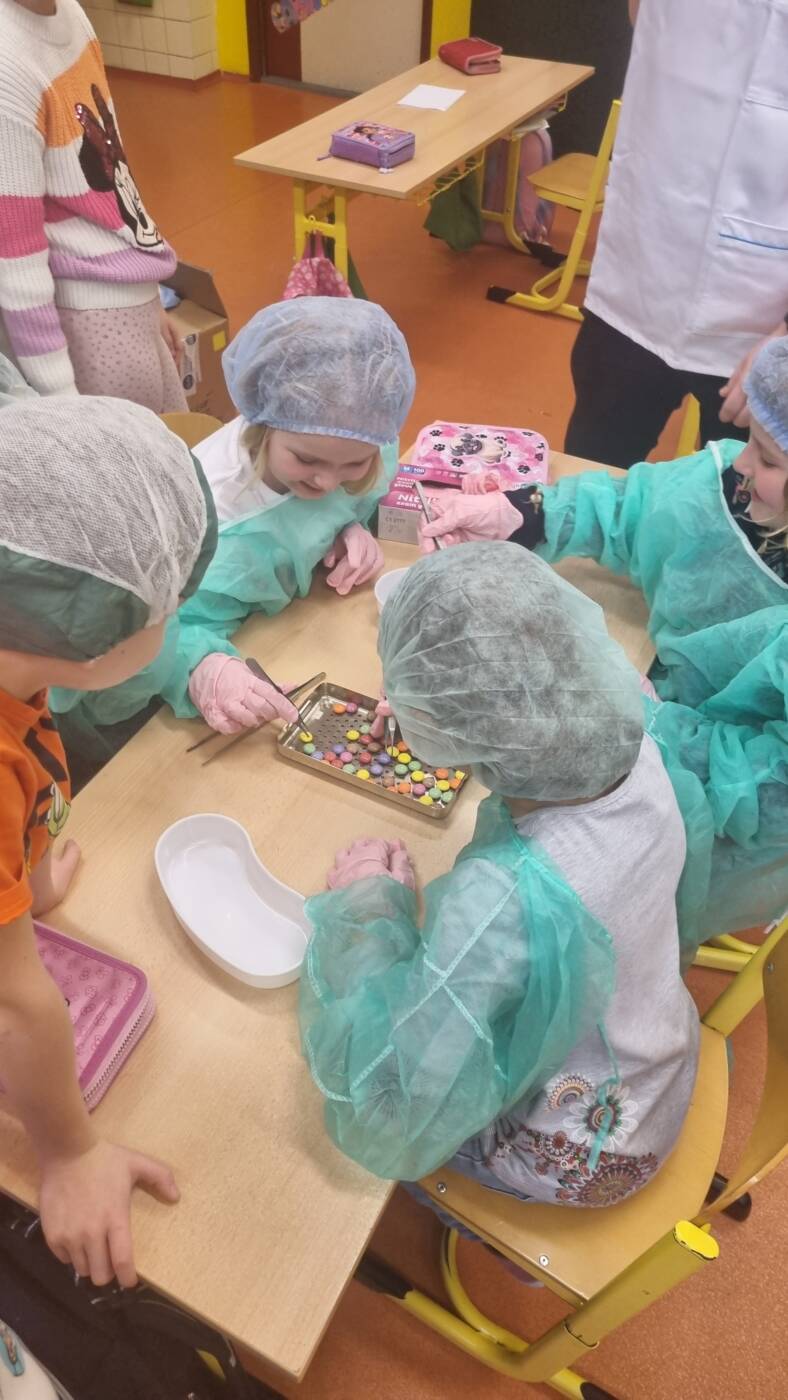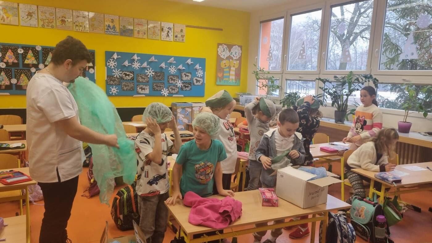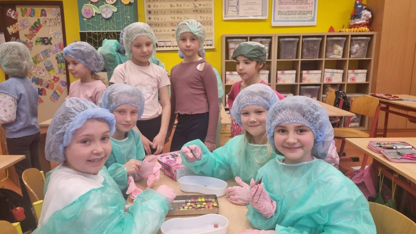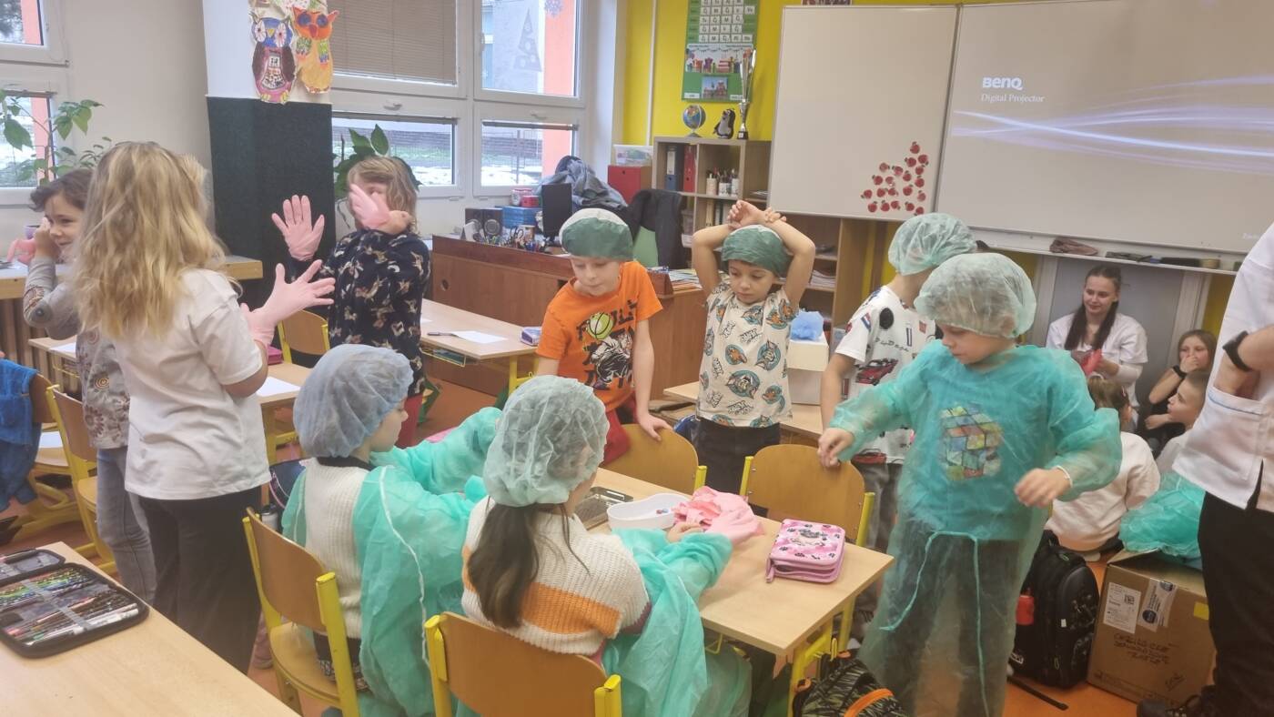 Jak se starat o svůj zrak? Jaké máme vnitřní orgány? Takové otázky nám zodpověděli budoucí zdravotníci, kteří si pro nás připravili výuku. Velice se nám líbilo, když jsem se oblékli jako lékaři a museli odborně pracovat s pinzetou.