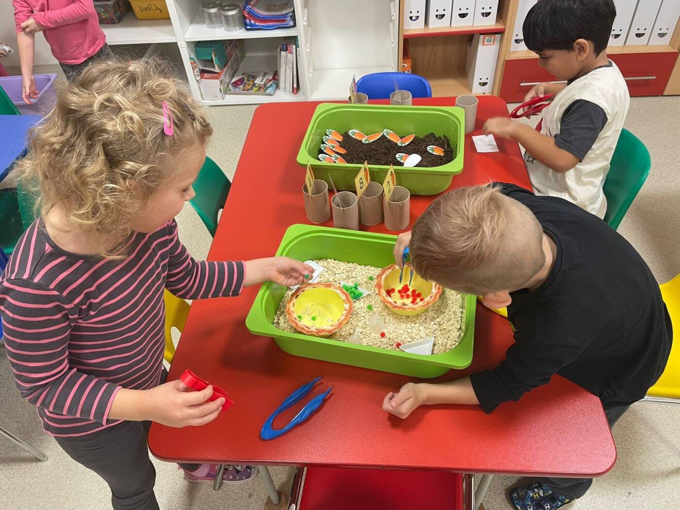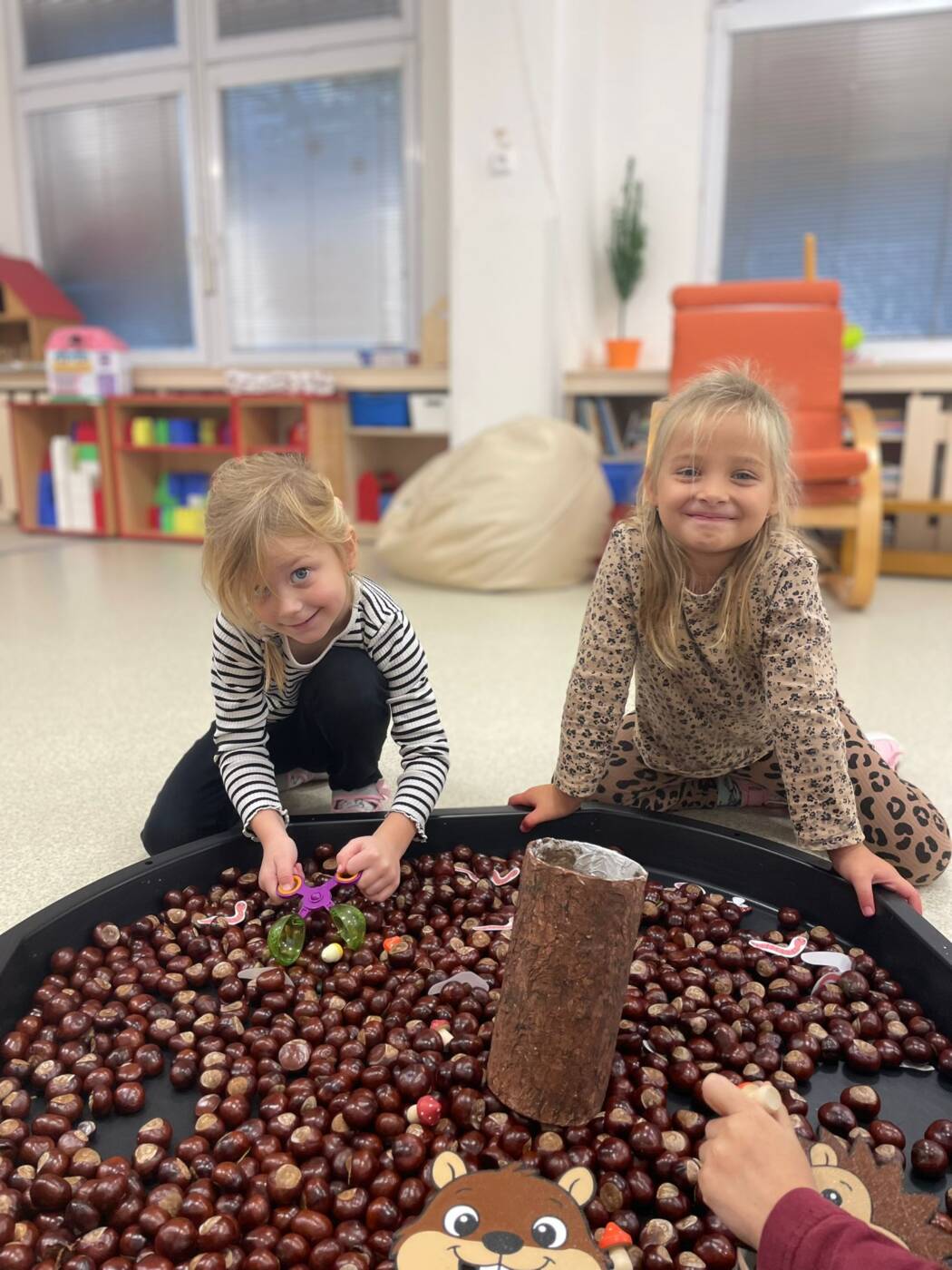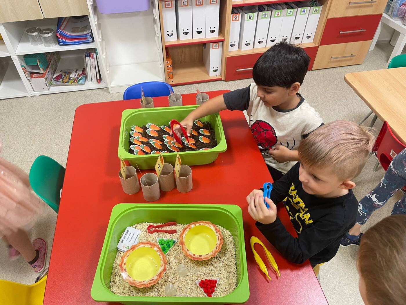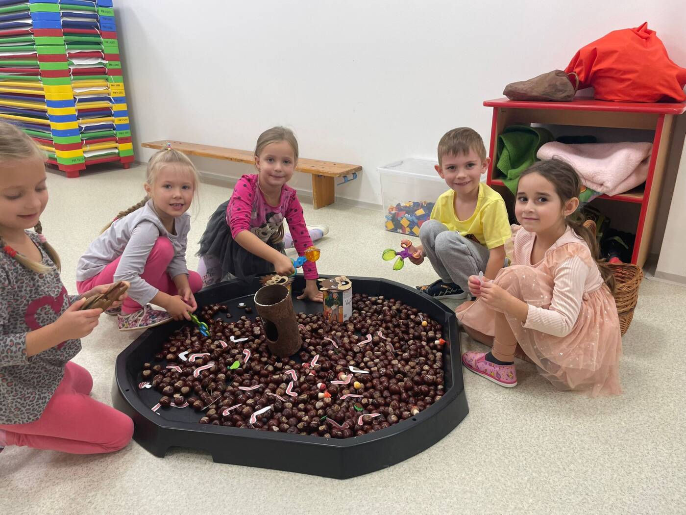Koťátka si užila Smyslohrátky – hledali jsme poklady v želé i slizu, stříhali čarodějnické vlasy ze špaget, lovili vodní perly a tahali mrkvičky pinzetou. Našli jsme i pár magnetických pokladů v barevné rýži, nakrmili hladová zvířátka a zatloukli ježečkovi pořádnou dávku bodlinek. Prostě dopoledne, které mělo všech pět smyslů!