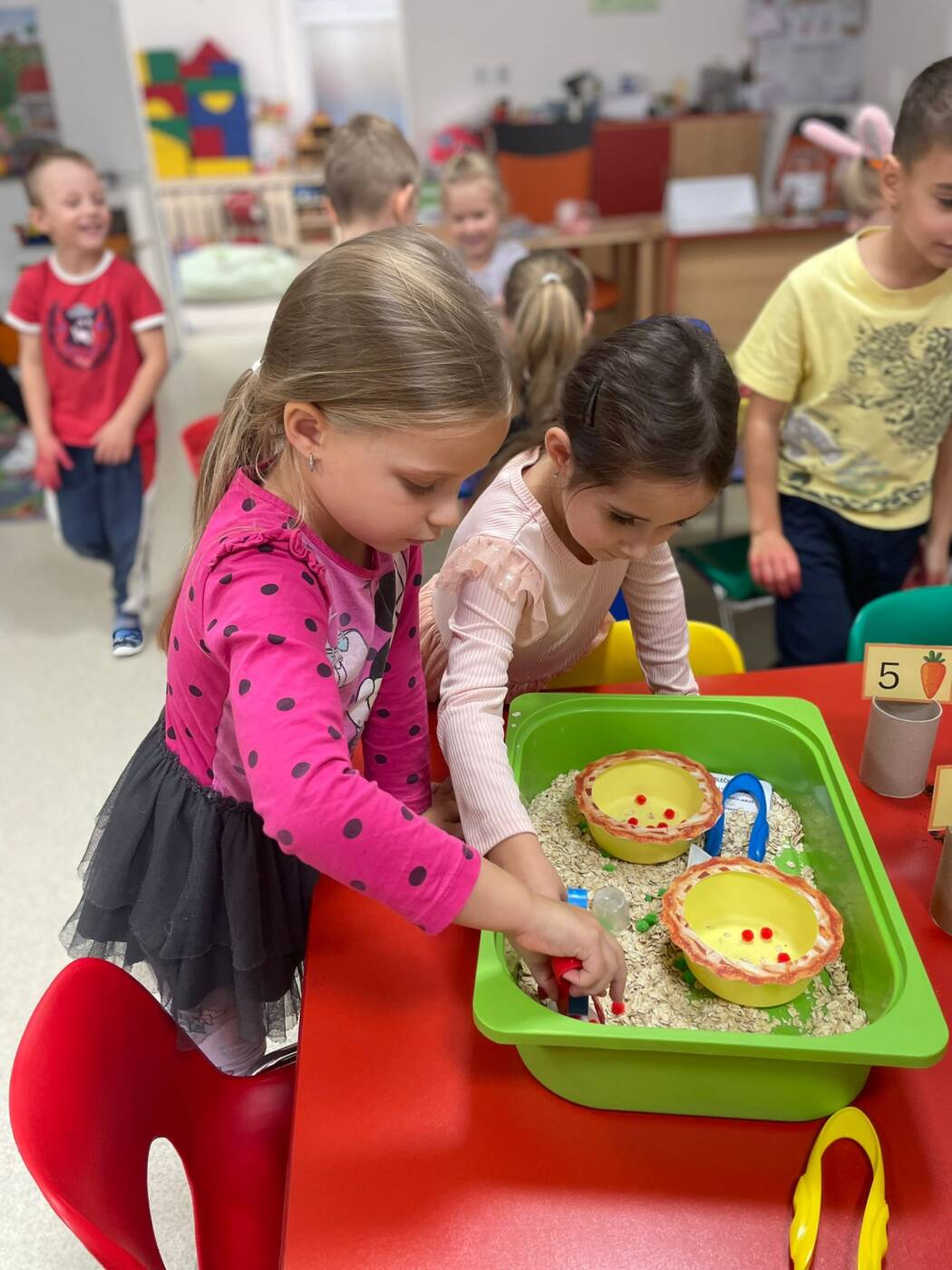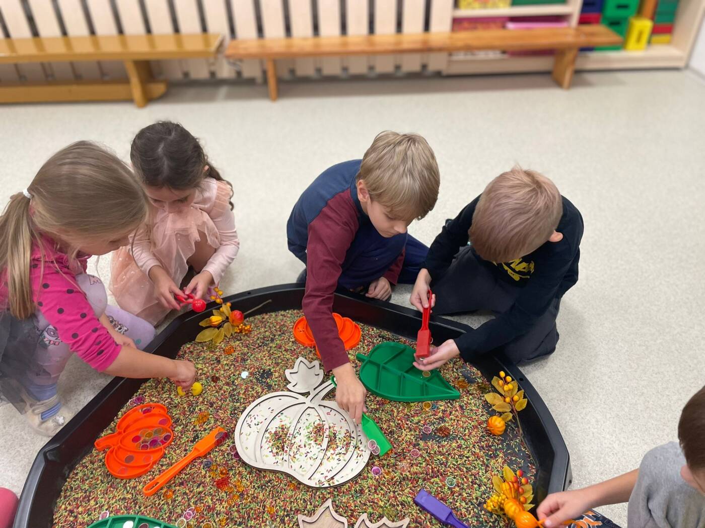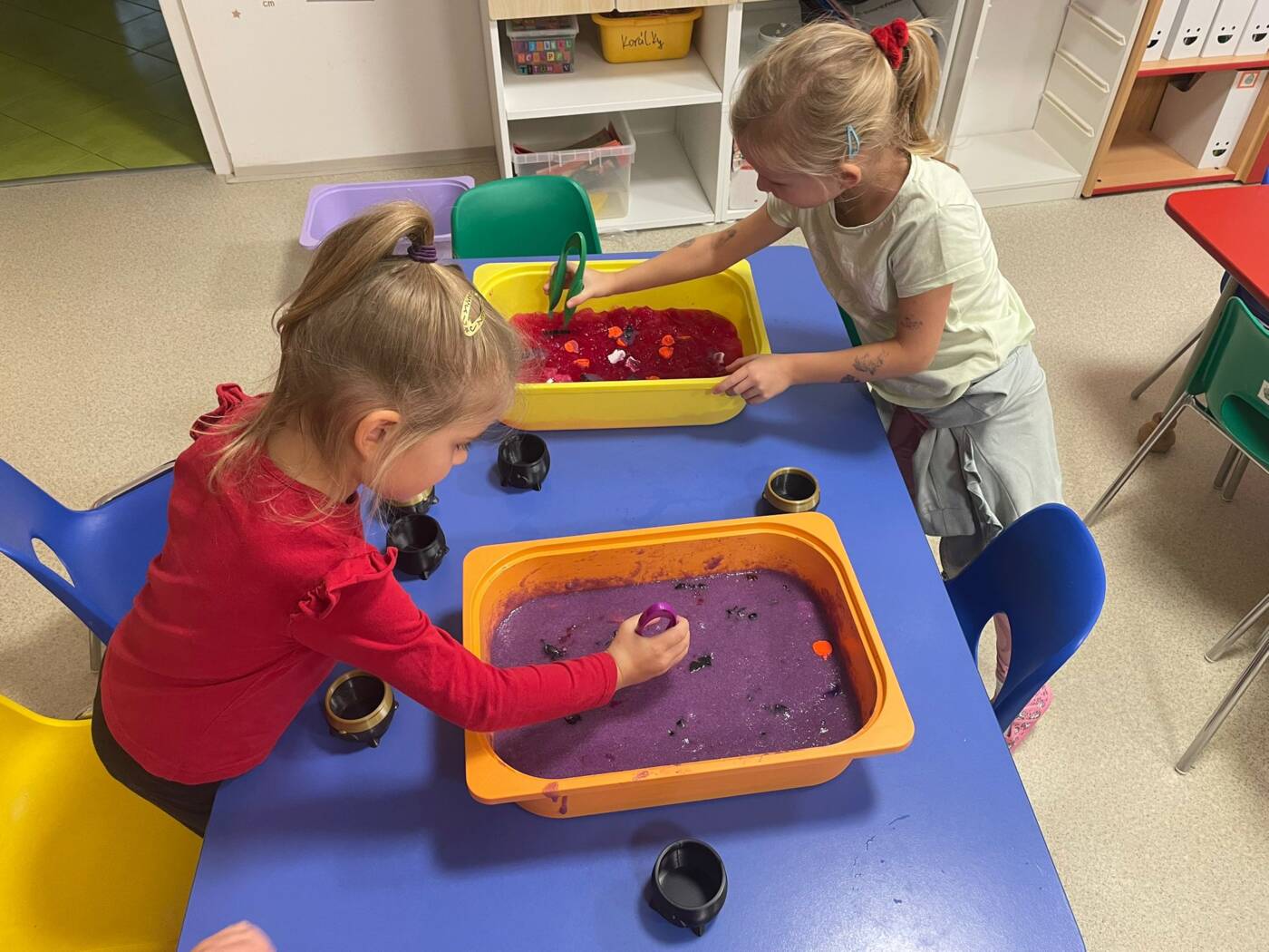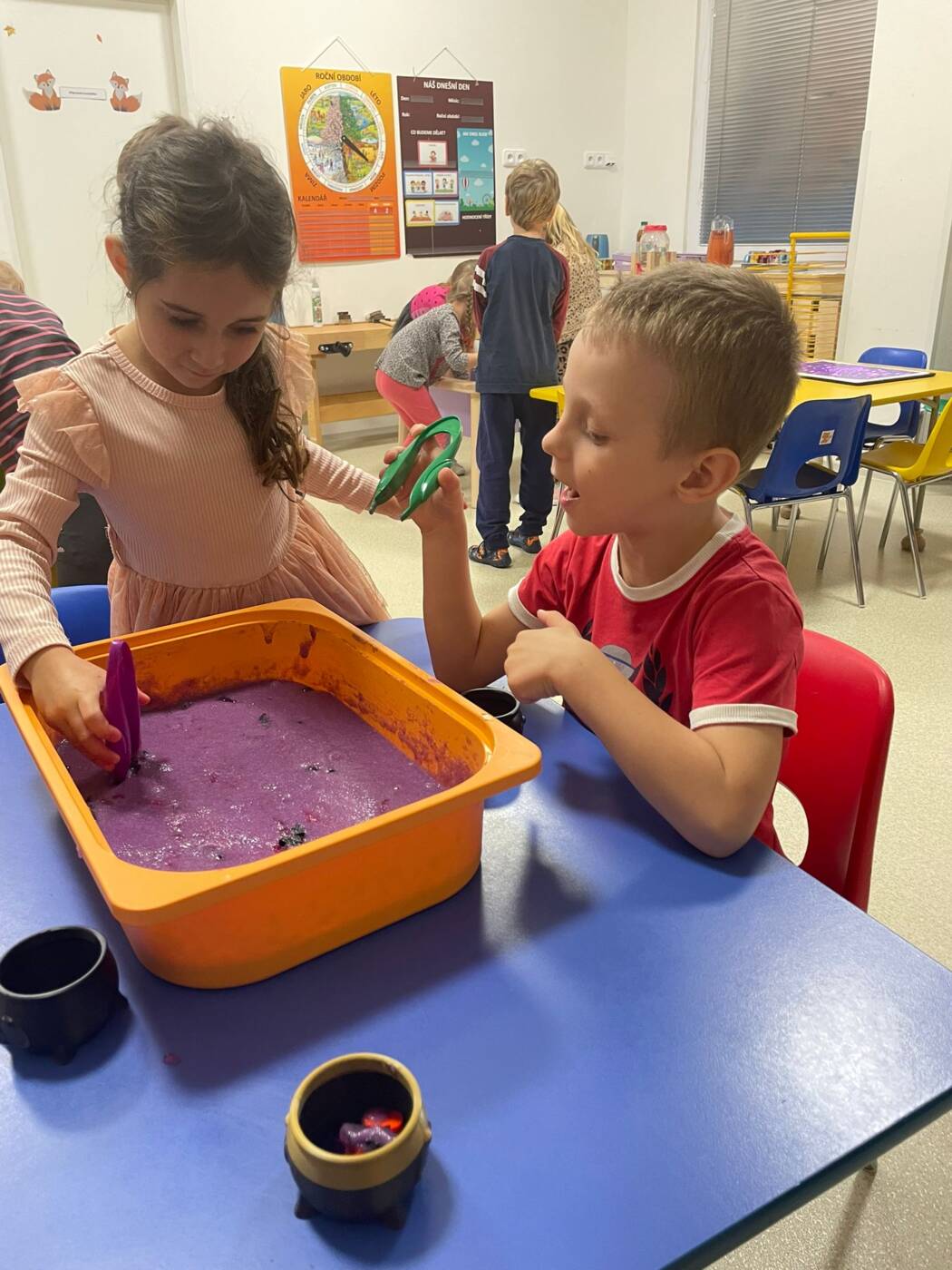 Koťátka si užila Smyslohrátky – hledali jsme poklady v želé i slizu, stříhali čarodějnické vlasy ze špaget, lovili vodní perly a tahali mrkvičky pinzetou. Našli jsme i pár magnetických pokladů v barevné rýži, nakrmili hladová zvířátka a zatloukli ježečkovi pořádnou dávku bodlinek. Prostě dopoledne, které mělo všech pět smyslů!
