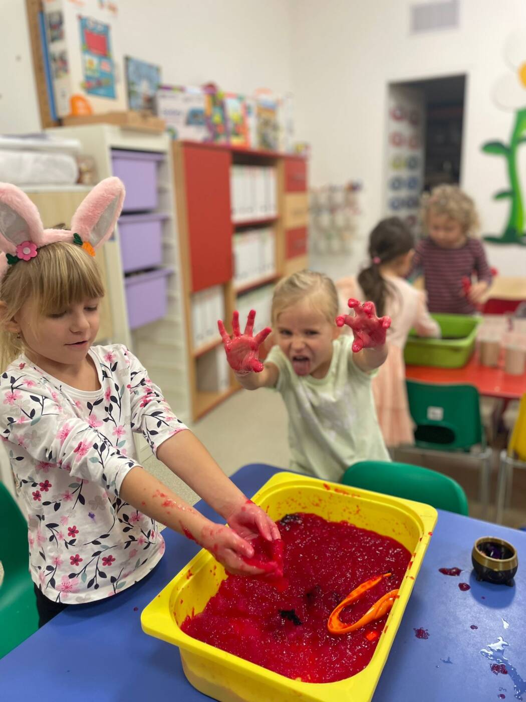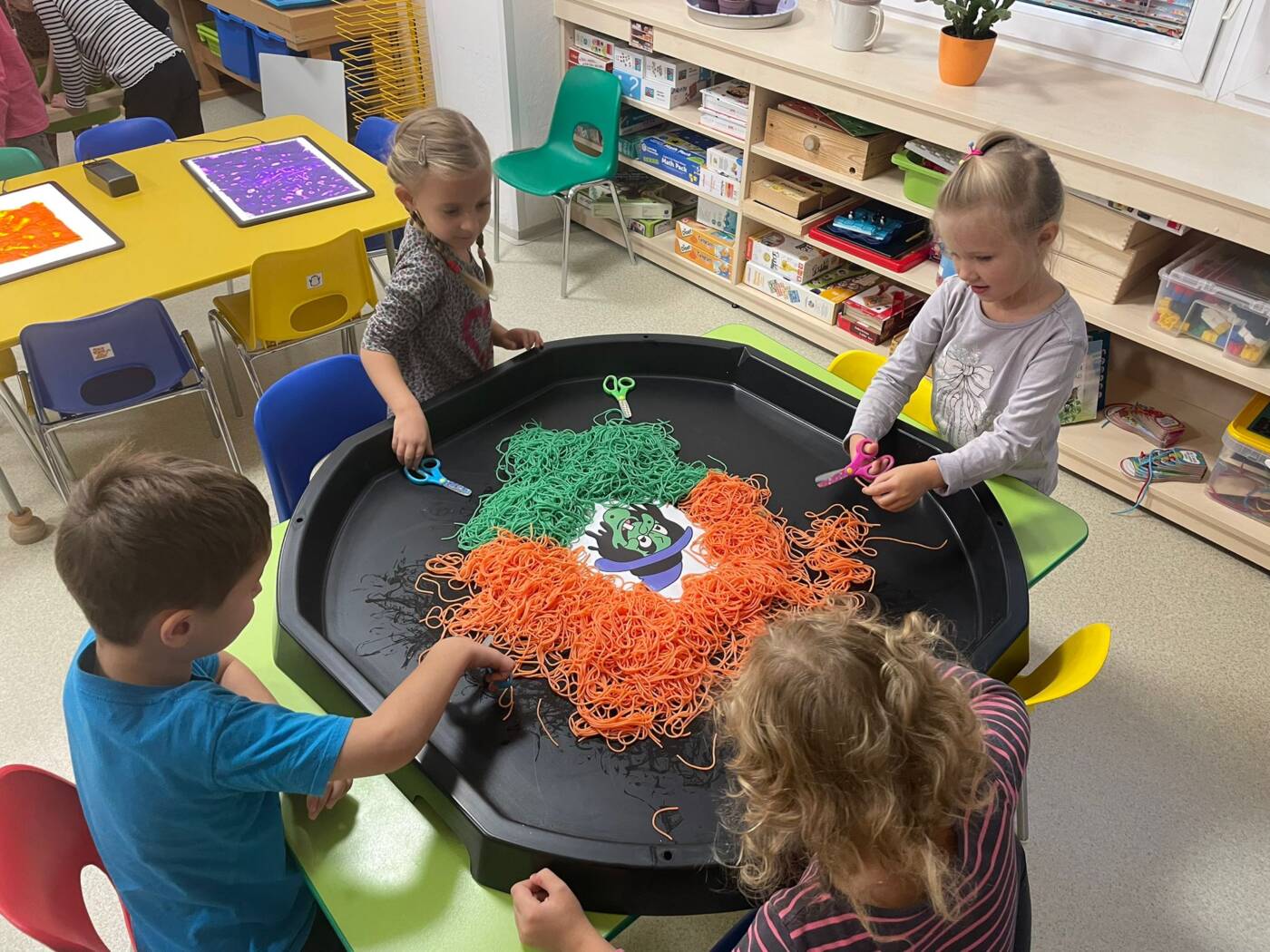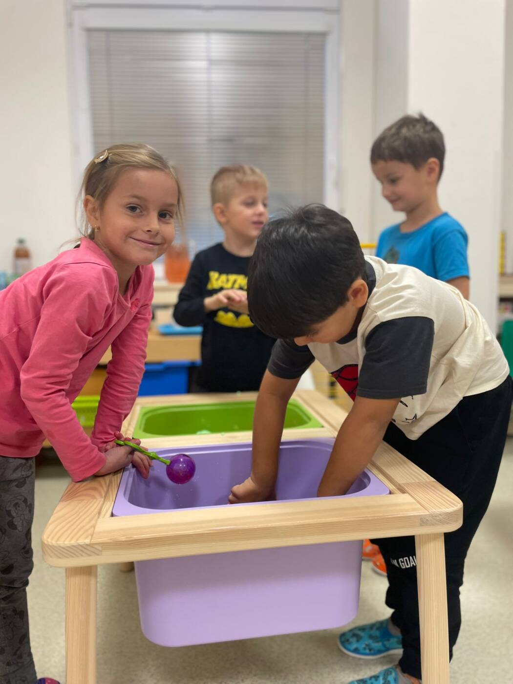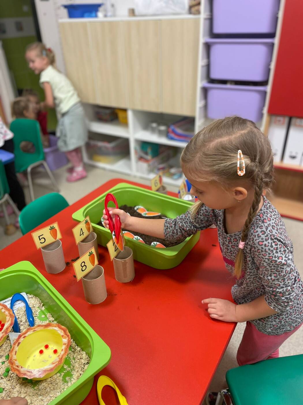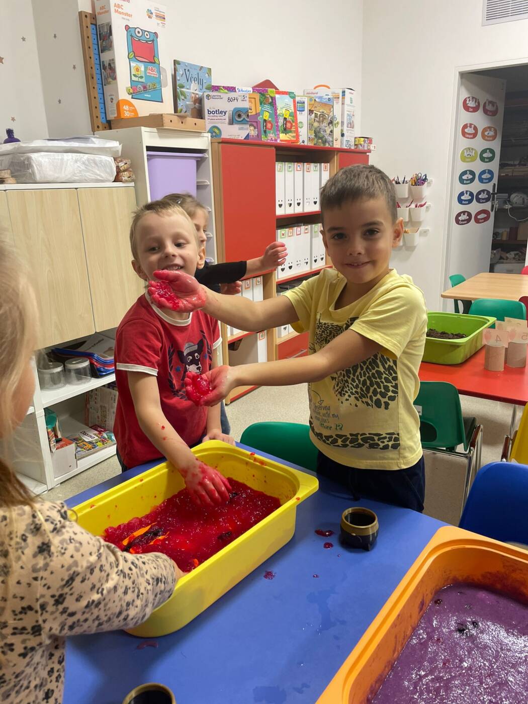 Koťátka si užila Smyslohrátky – hledali jsme poklady v želé i slizu, stříhali čarodějnické vlasy ze špaget, lovili vodní perly a tahali mrkvičky pinzetou. Našli jsme i pár magnetických pokladů v barevné rýži, nakrmili hladová zvířátka a zatloukli ježečkovi pořádnou dávku bodlinek. Prostě dopoledne, které mělo všech pět smyslů!