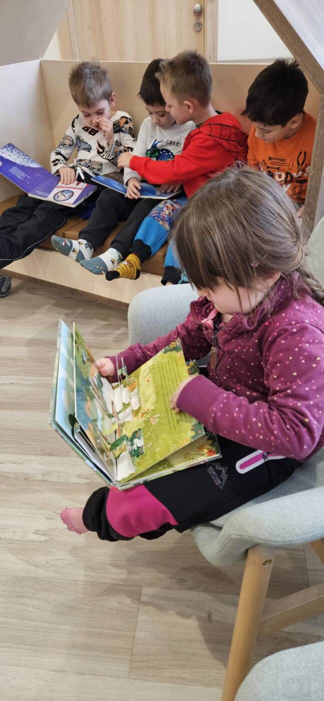 Dnes se naše třída vydala na vánoční tvořivou dílnu do knihovny V Zálomu. Děti se nejprve naladily na zimní období povídáním o zvířátkách, která v zimě spí, i o těch, která zůstávají aktivní. S paní knihovnicí si povídaly o aktivitách v zimě a o tom, co v tomto období nejraději dělají. Potom pracovaly ve skupinkách a plnily úkoly spojené s knížkami se zimní tématikou.