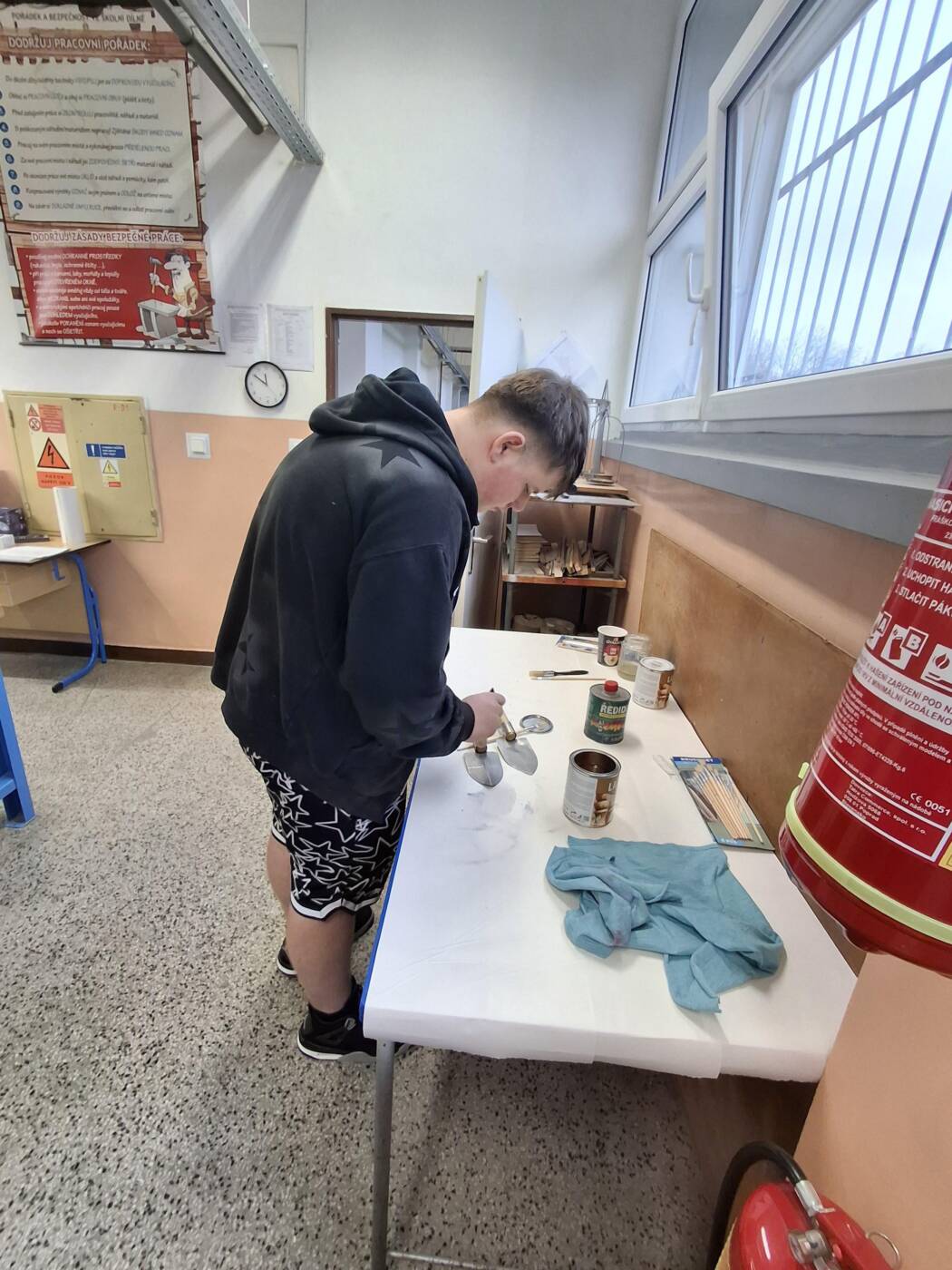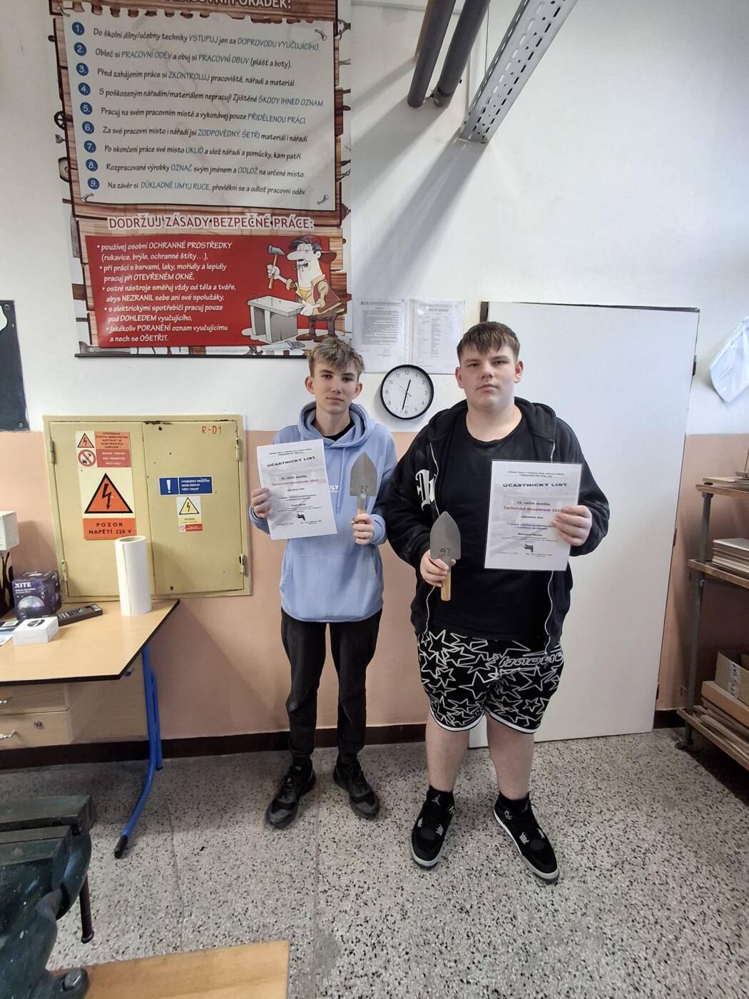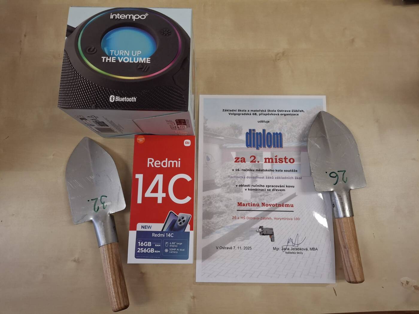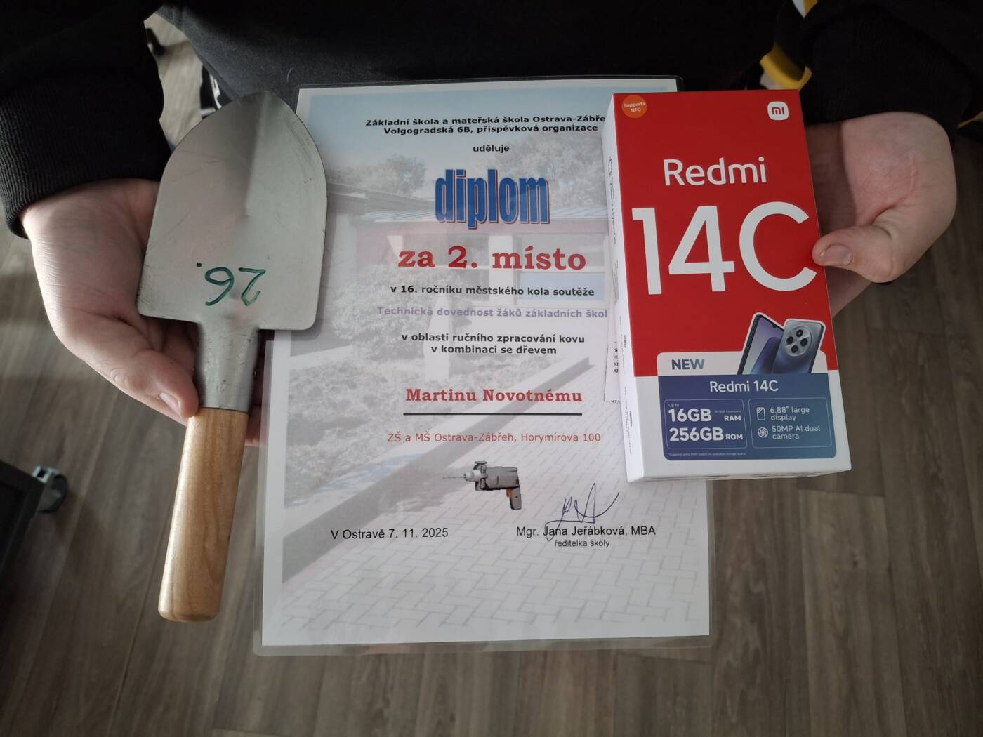 Dne 3.11.2025 se David Duda a Martin Novotný z 8.A třídy zúčastnili soutěže Technická dovednost na ZŠ Volgogradské 6B. Během pětihodinové práce ve školní dílně měli soutěžící za úkol vyrobit kombinovaný výrobek z dřeva a kovu, a to zahradní lopatku.