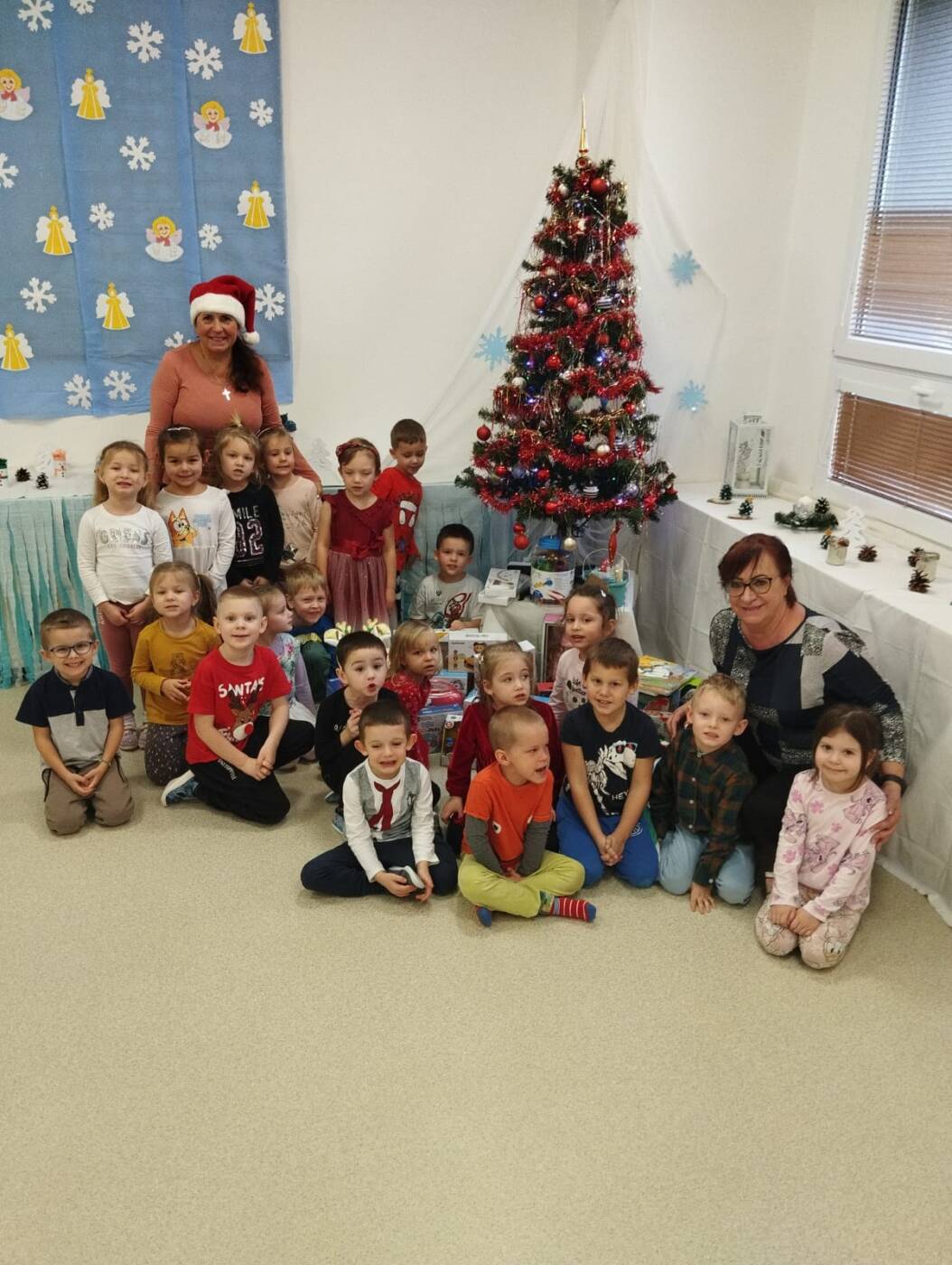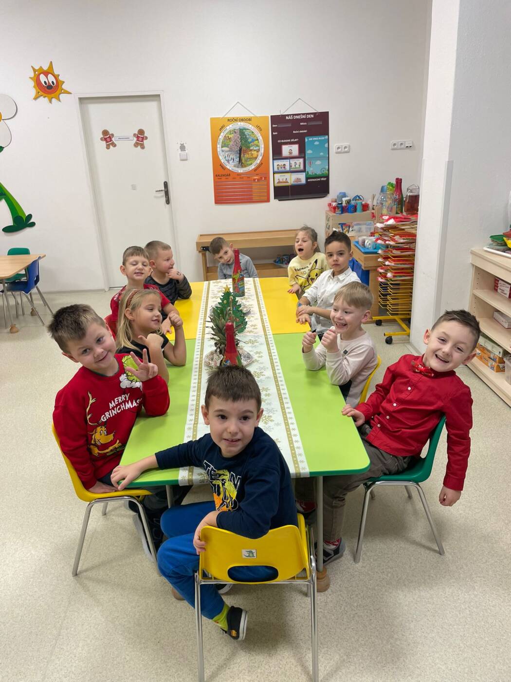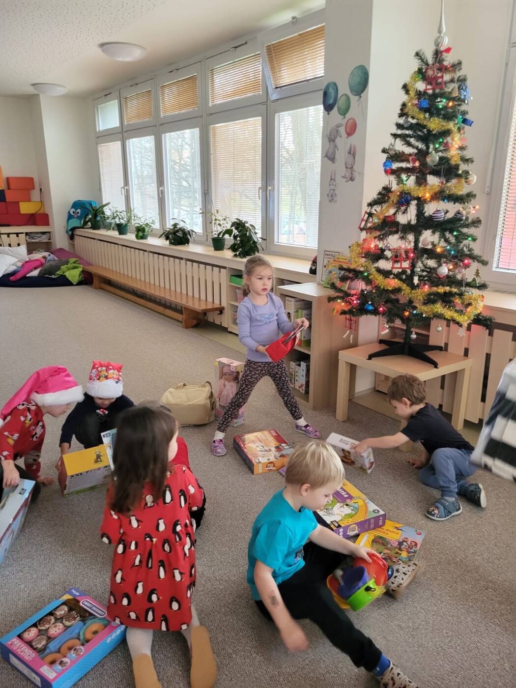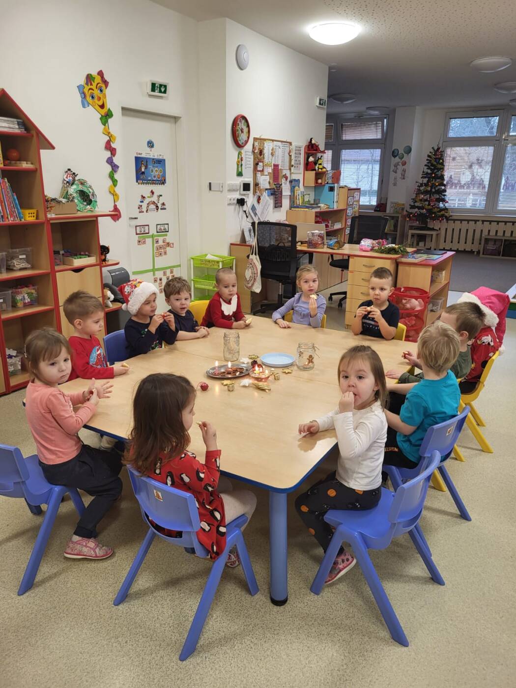 Už od rána kluci a holky vyhlíželi Ježíška. Ze všech tříd bylo slyšet koledy, děti si vyprávěly o tradicích a ochutnávaly cukroví, které si ve školce společně upekly. Na svátečně prostřených stolech nechybělo exotické ovoce, slané a sladké dobrůtky a dětské šampaňské. Všichni čekali na cinkot zvonečku a překvapení pod stromečkem, kde byly nádherné nové hračky. Celý den byl zahalen do sváteční atmosféry, plné radosti v dětských očích.