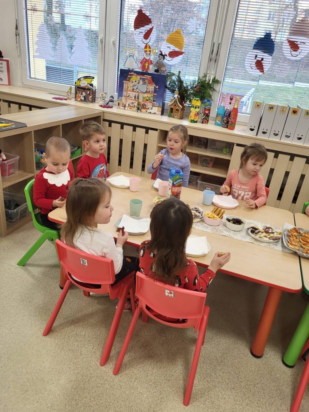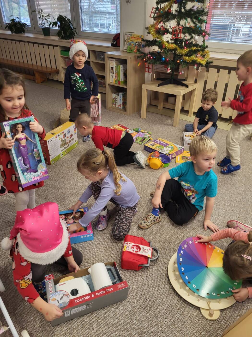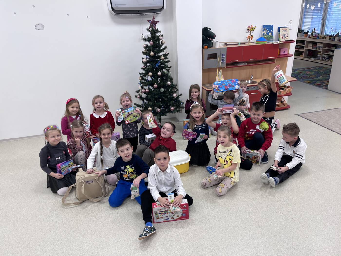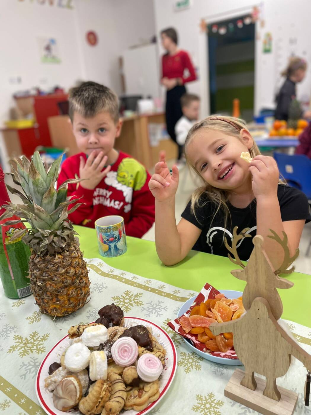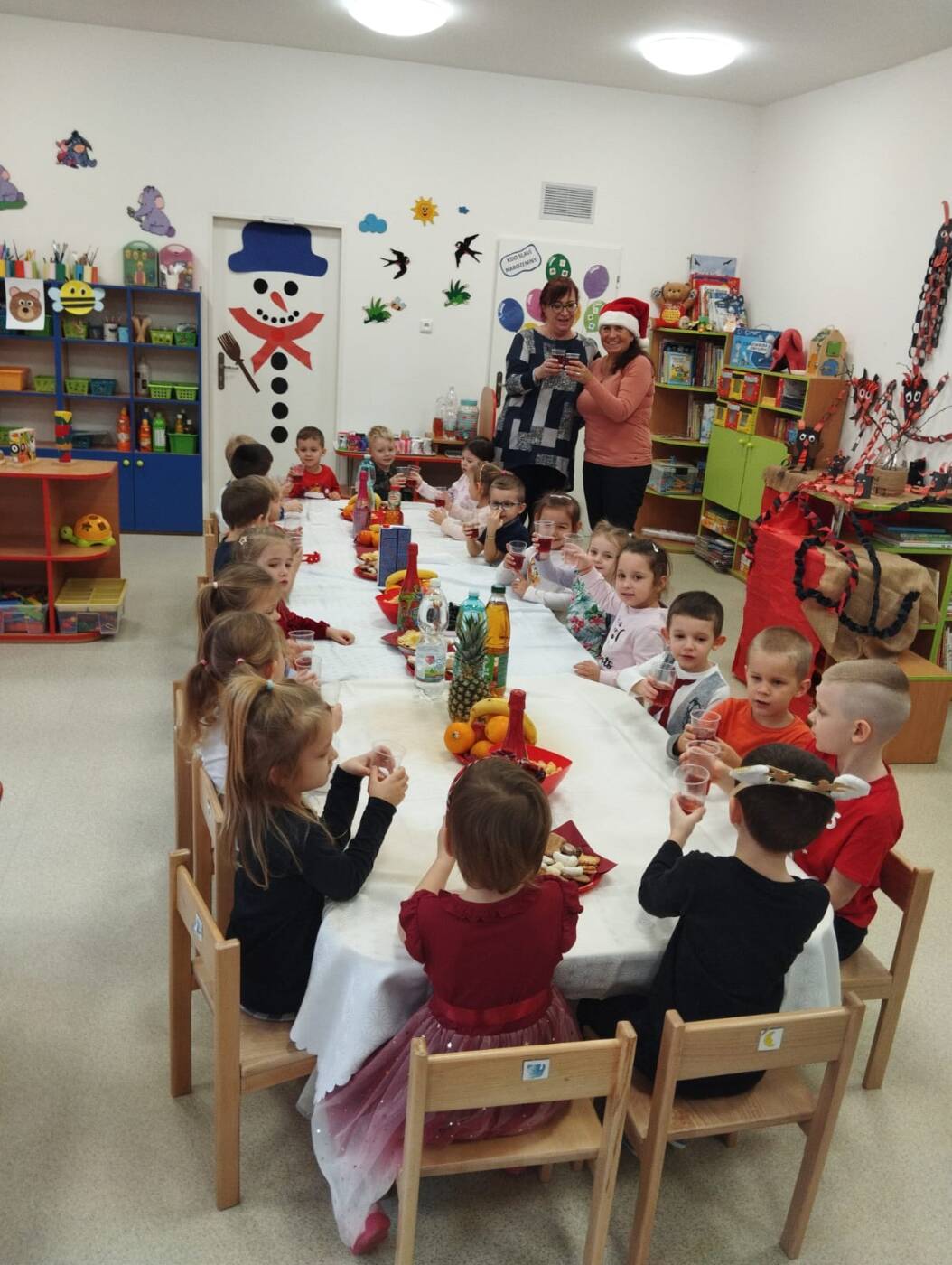 Už od rána kluci a holky vyhlíželi Ježíška. Ze všech tříd bylo slyšet koledy, děti si vyprávěly o tradicích a ochutnávaly cukroví, které si ve školce společně upekly. Na svátečně prostřených stolech nechybělo exotické ovoce, slané a sladké dobrůtky a dětské šampaňské. Všichni čekali na cinkot zvonečku a překvapení pod stromečkem, kde byly nádherné nové hračky. Celý den byl zahalen do sváteční atmosféry, plné radosti v dětských očích.