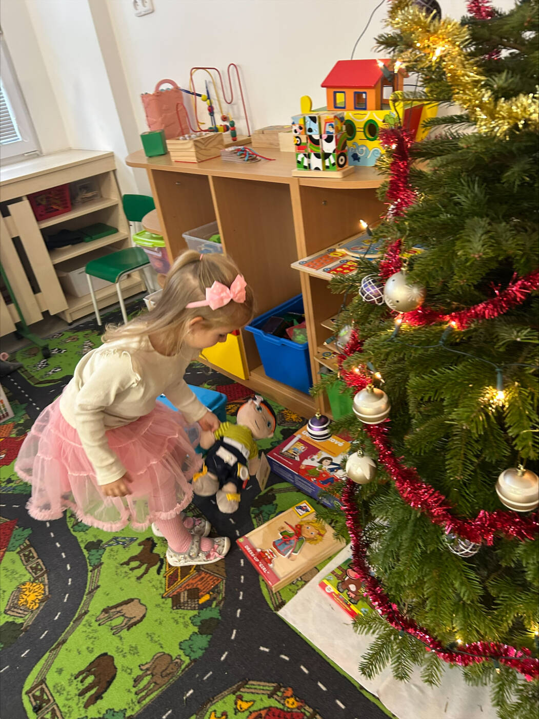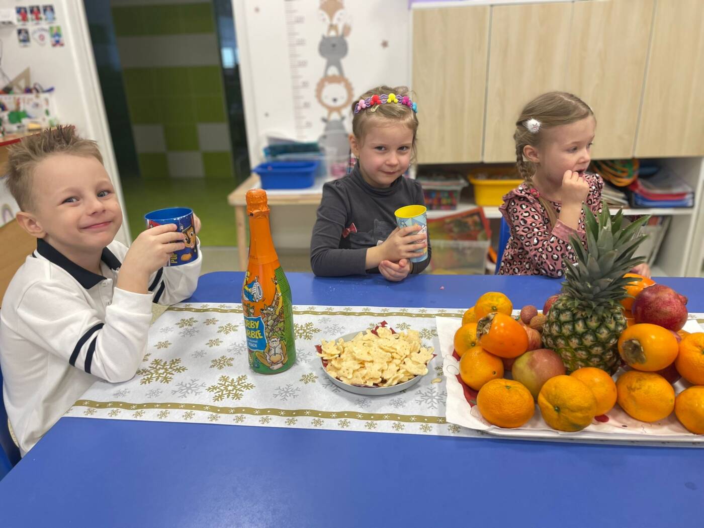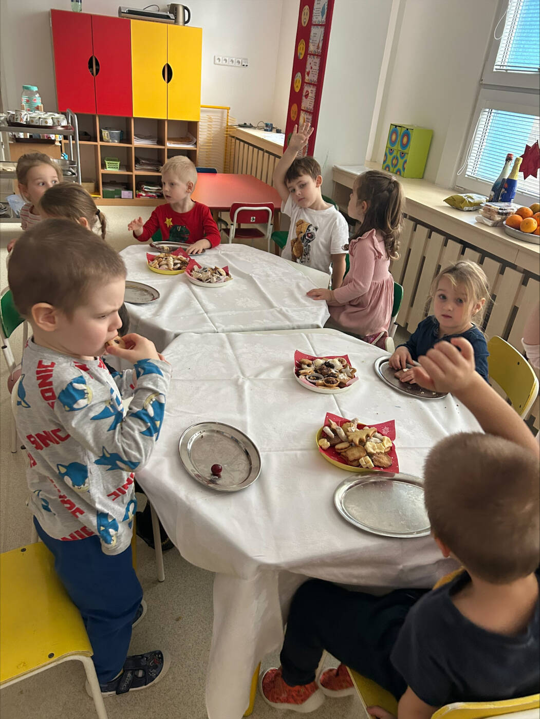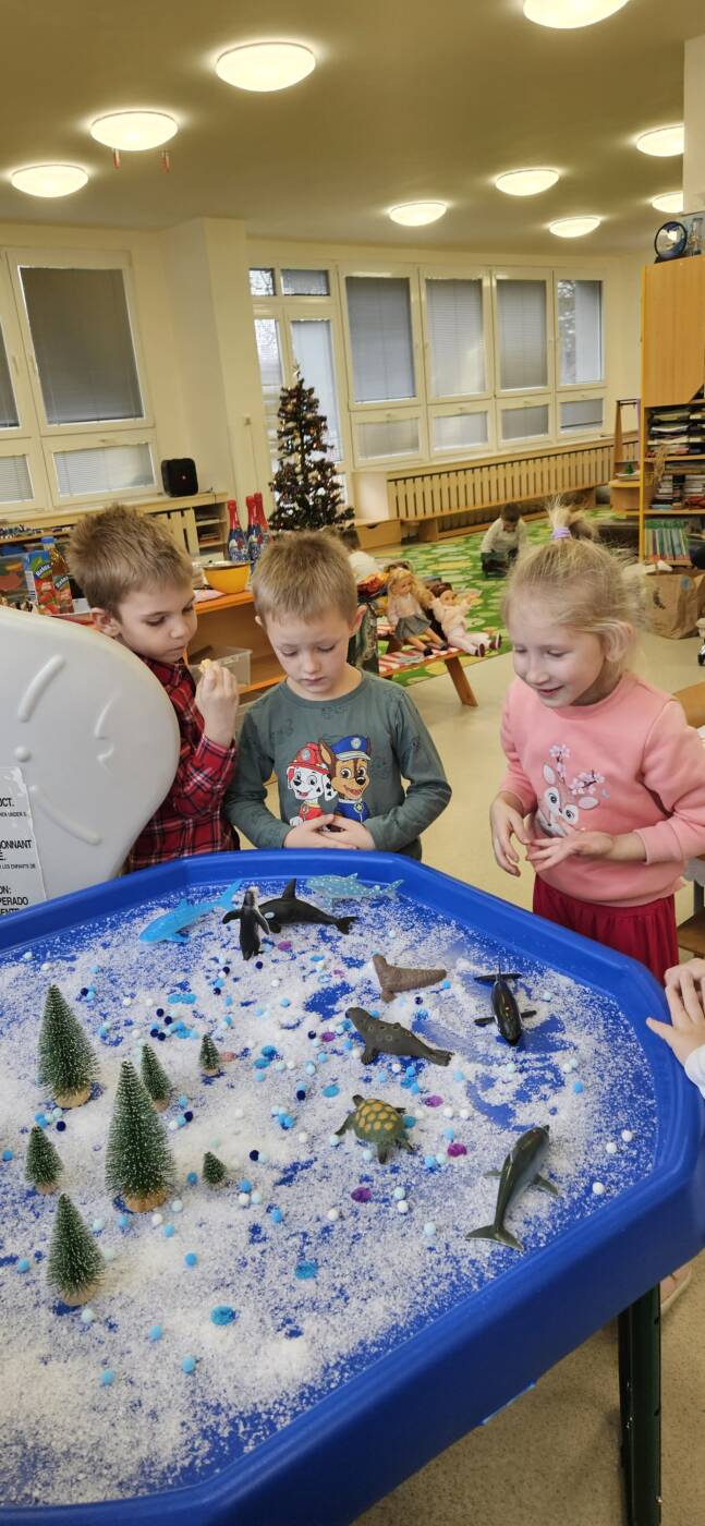Už od rána kluci a holky vyhlíželi Ježíška. Ze všech tříd bylo slyšet koledy, děti si vyprávěly o tradicích a ochutnávaly cukroví, které si ve školce společně upekly. Na svátečně prostřených stolech nechybělo exotické ovoce, slané a sladké dobrůtky a dětské šampaňské. Všichni čekali na cinkot zvonečku a překvapení pod stromečkem, kde byly nádherné nové hračky. Celý den byl zahalen do sváteční atmosféry, plné radosti v dětských očích.