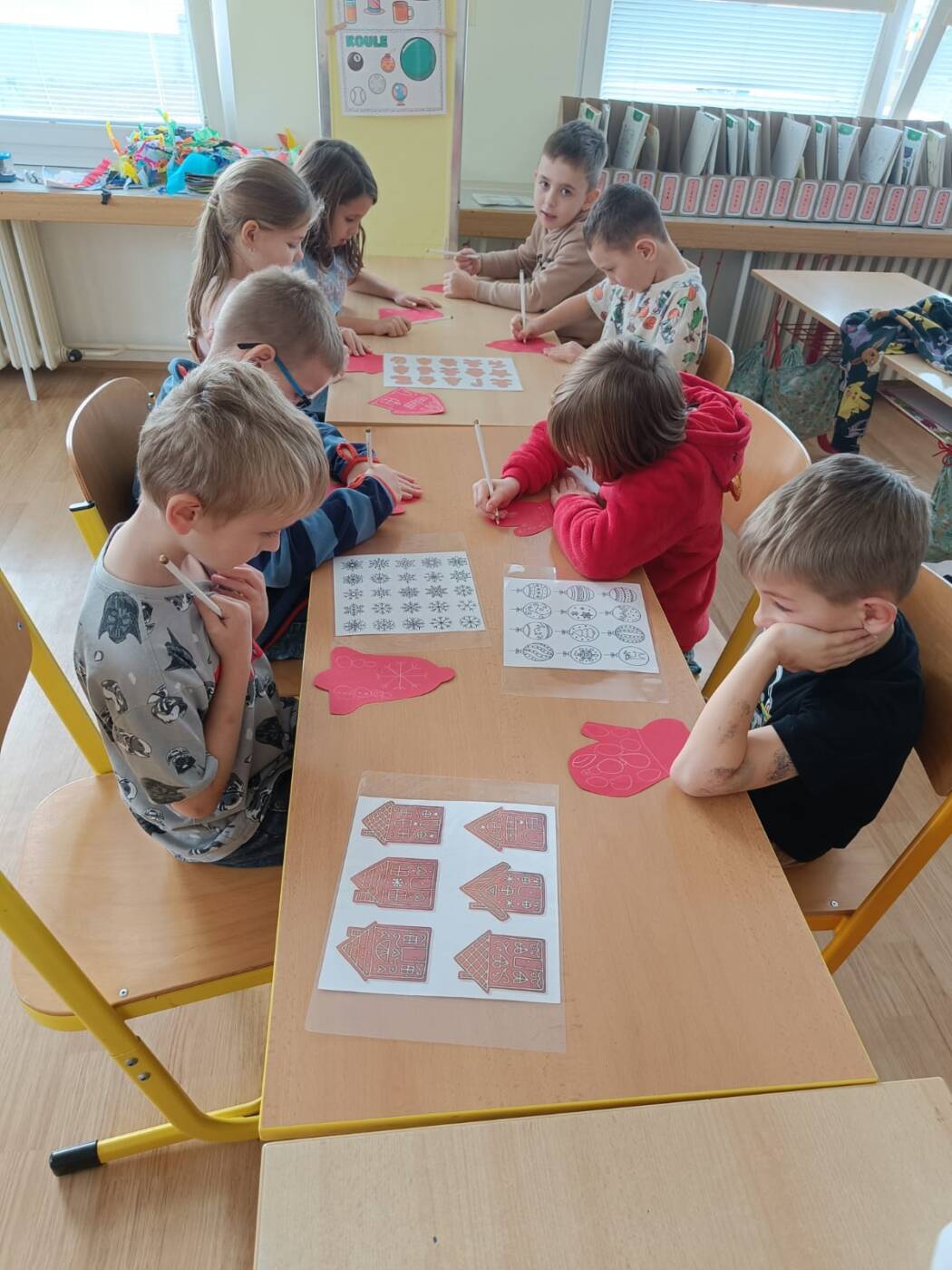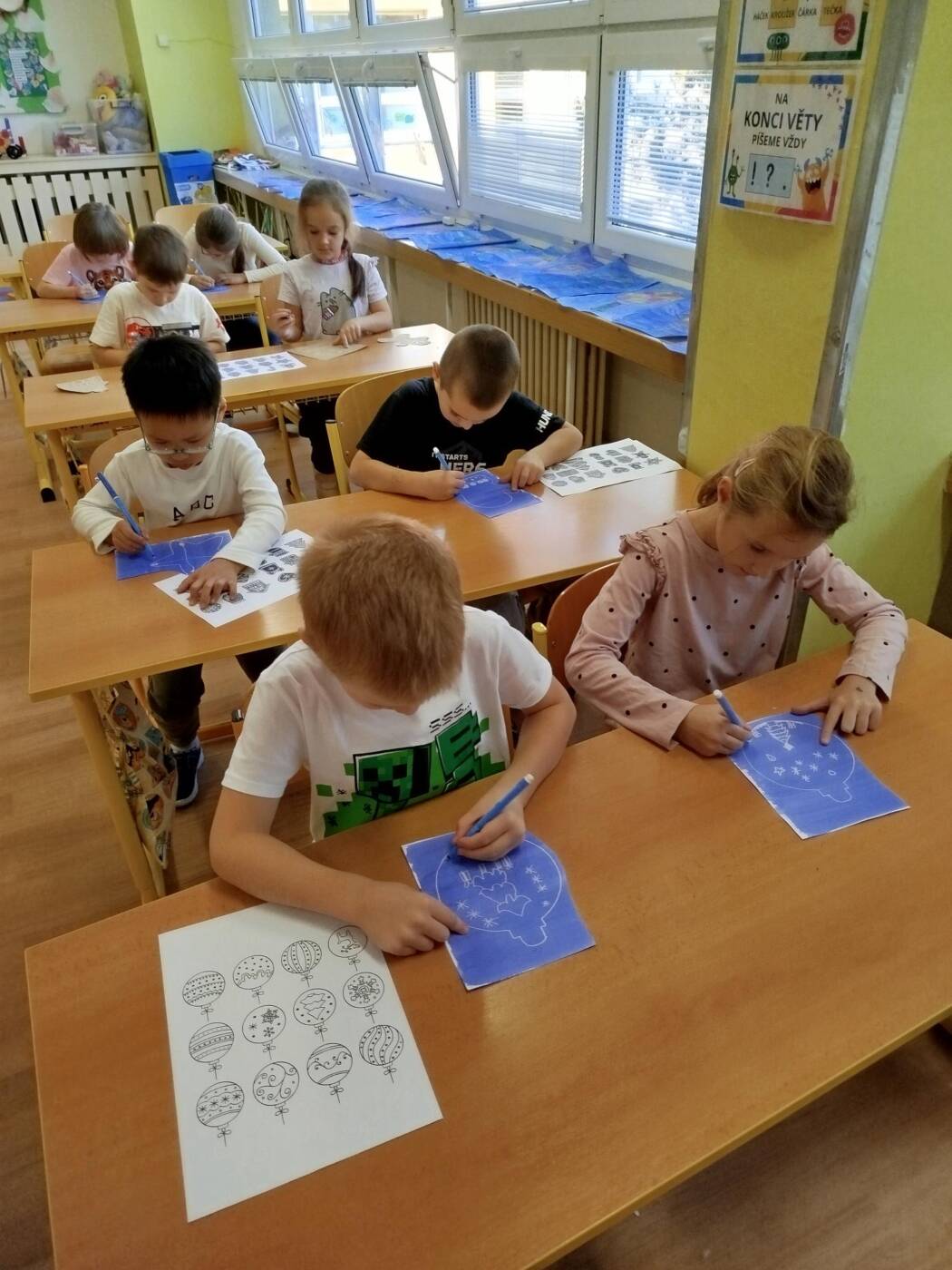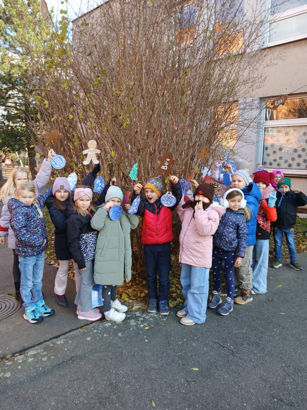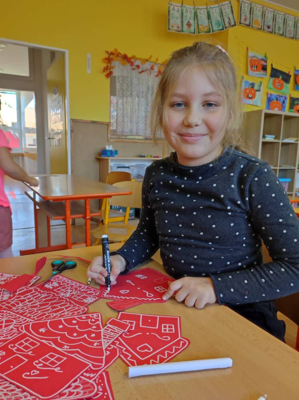 Děti v družince s radostí vytvářely obrázky s vánoční tématikou na barevný papír pomocí zmizíku a bílého fixu, takže jejich motivy krásně vystoupily na povrch. Jejich nápadité výtvory, které nyní zdobí jídelnu i keře před budovou, vytvářejí útulnou vánoční atmosféru a ukazují, jak kreativně dokážou děti pracovat s jednoduchými pomůckami.