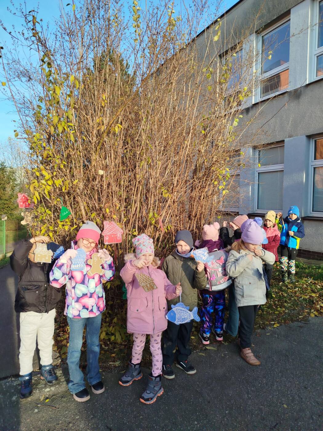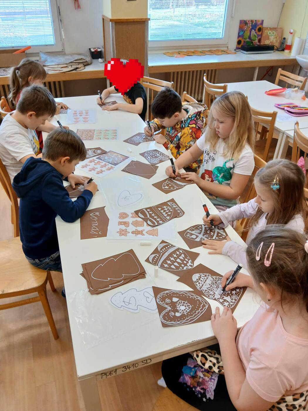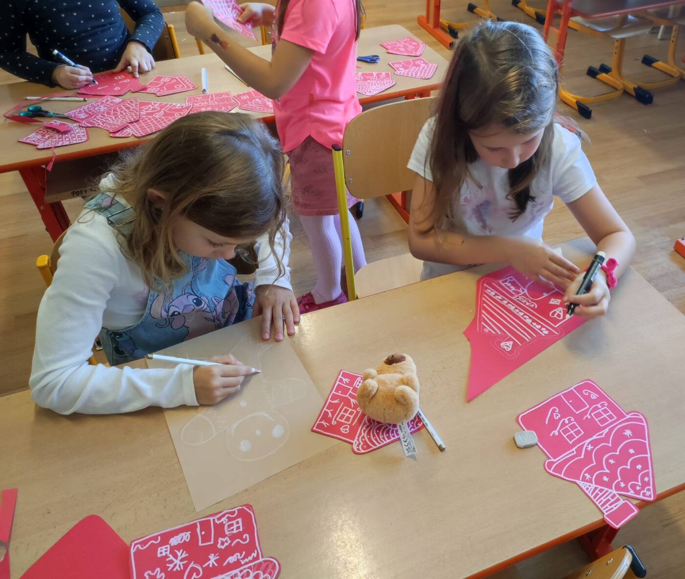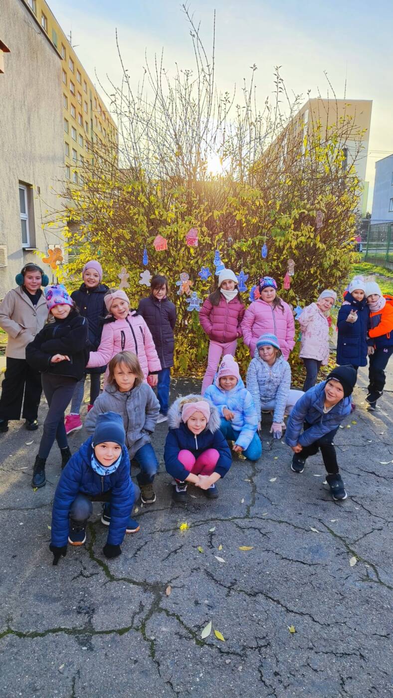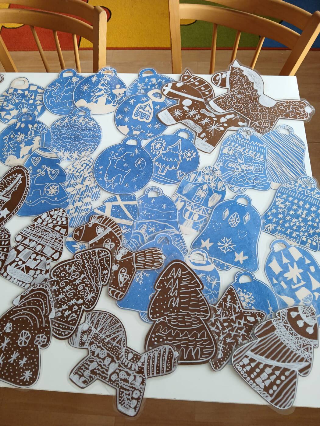 Děti v družince s radostí vytvářely obrázky s vánoční tématikou na barevný papír pomocí zmizíku a bílého fixu, takže jejich motivy krásně vystoupily na povrch. Jejich nápadité výtvory, které nyní zdobí jídelnu i keře před budovou, vytvářejí útulnou vánoční atmosféru a ukazují, jak kreativně dokážou děti pracovat s jednoduchými pomůckami.