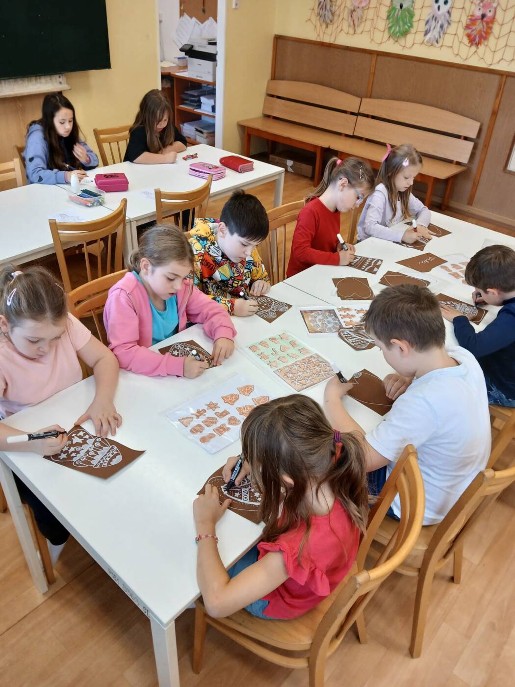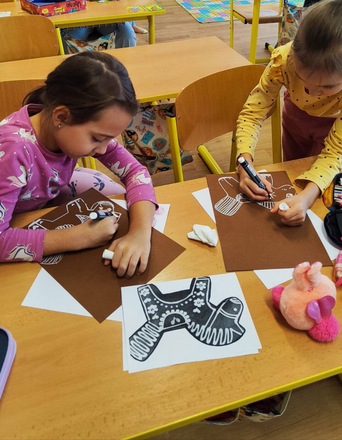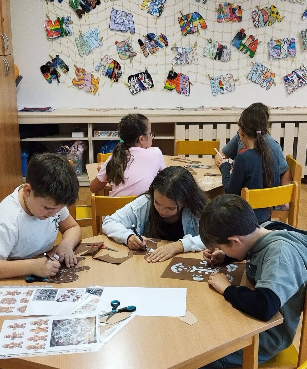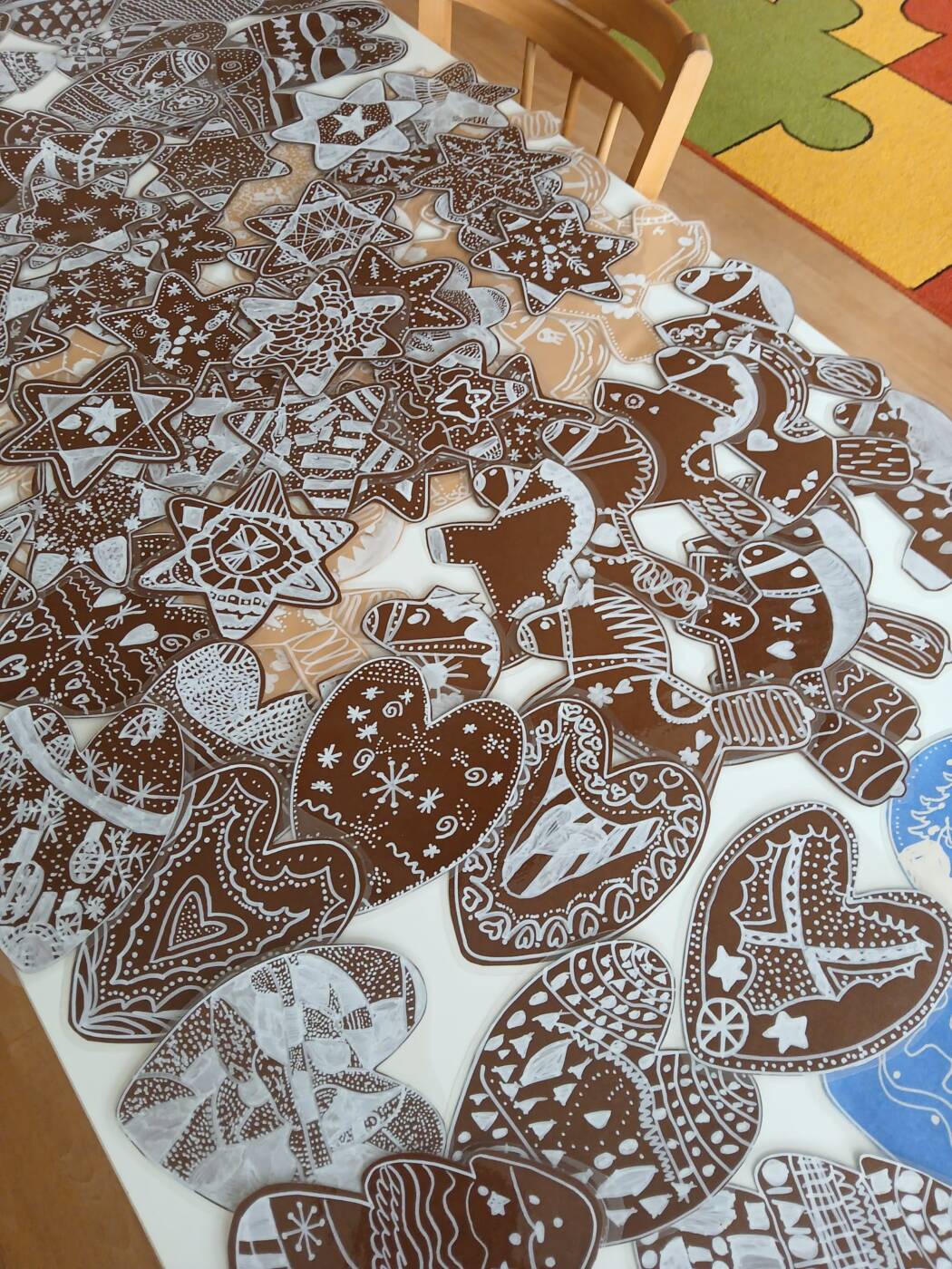 Děti v družince s radostí vytvářely obrázky s vánoční tématikou na barevný papír pomocí zmizíku a bílého fixu, takže jejich motivy krásně vystoupily na povrch. Jejich nápadité výtvory, které nyní zdobí jídelnu i keře před budovou, vytvářejí útulnou vánoční atmosféru a ukazují, jak kreativně dokážou děti pracovat s jednoduchými pomůckami.