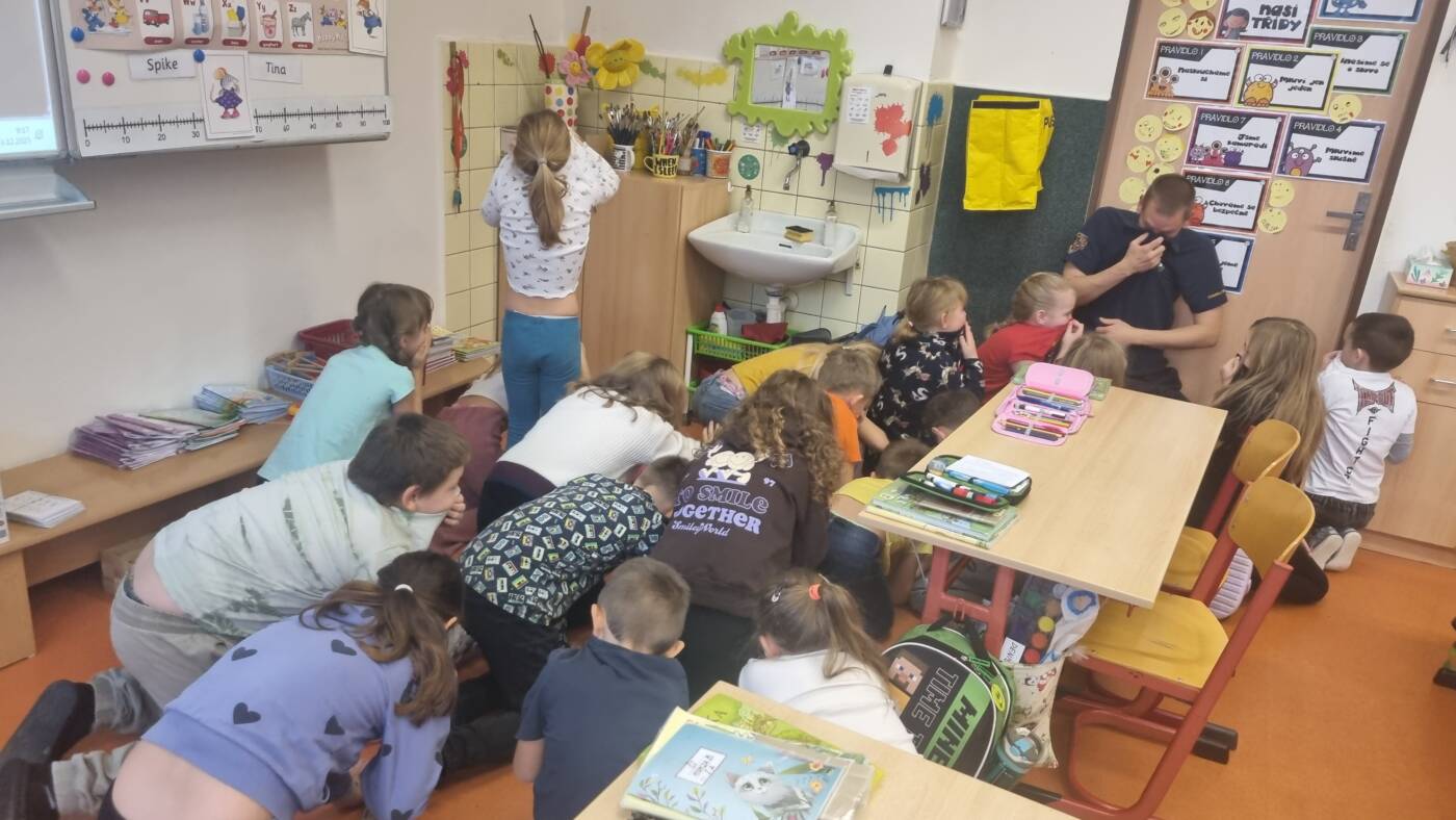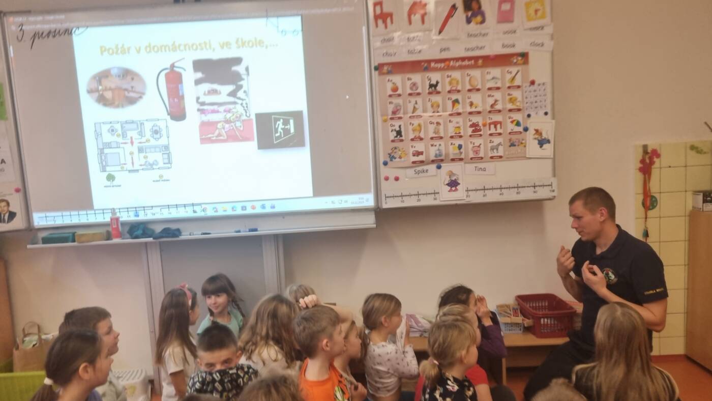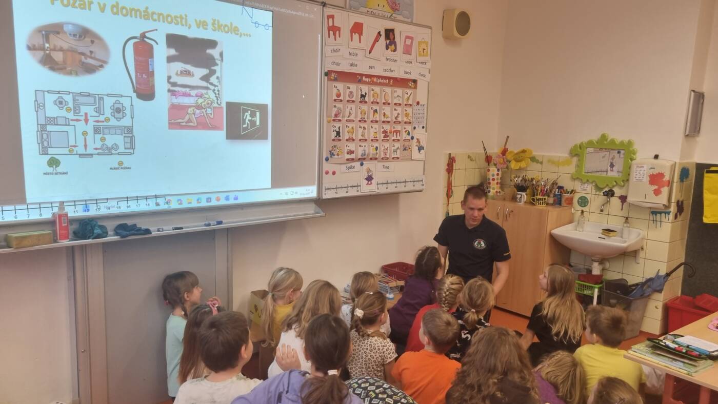 Jak se zachovat při vzniku požáru? Co mám dělat, když hoří? Tyto otázky jsme dnes trénovali s Hasíkem a s panem hasičem Markem Rodákem ve výuce.