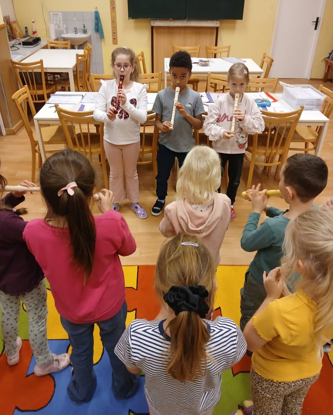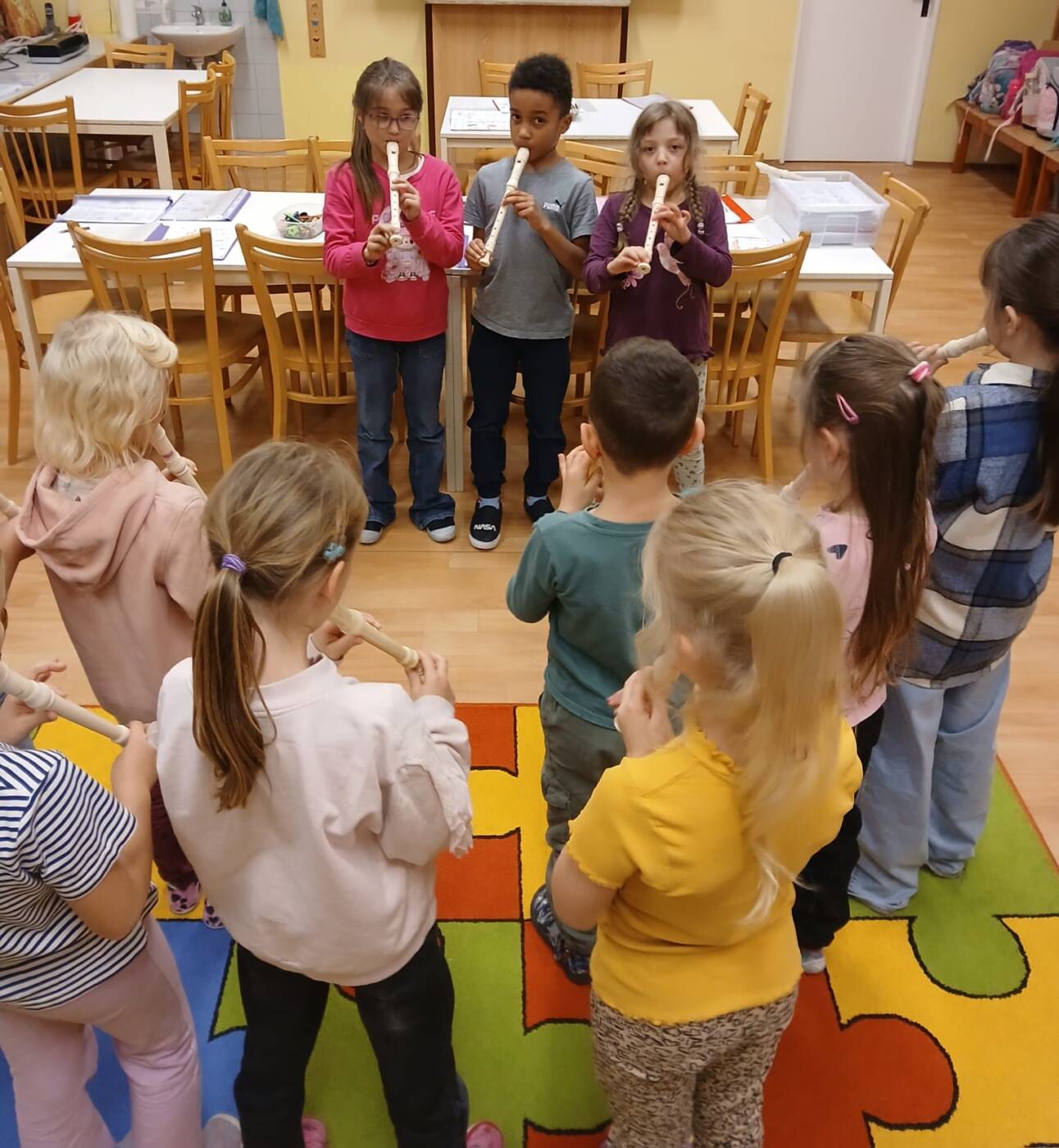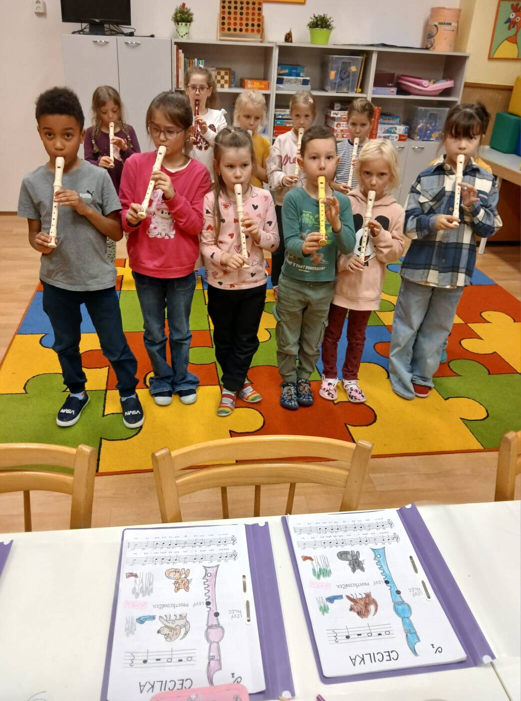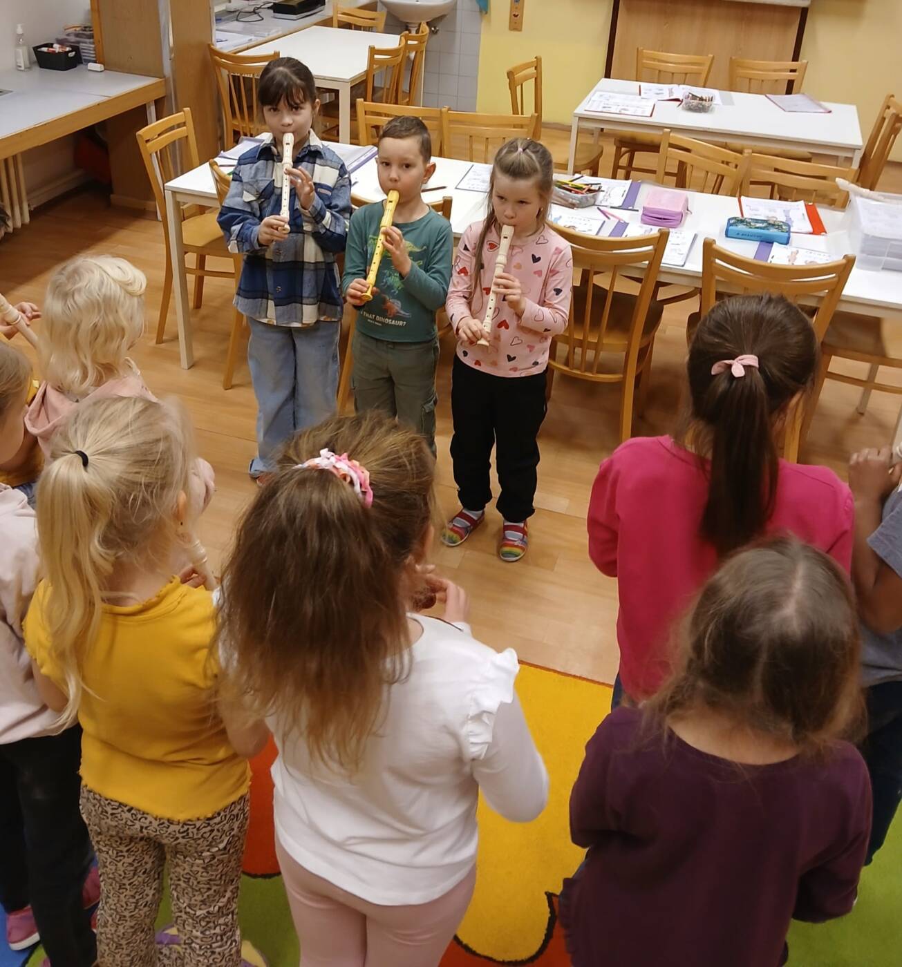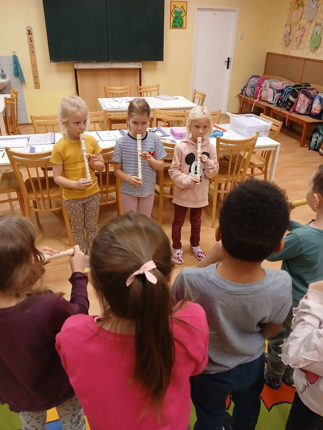 Malujeme flétničky, učíme se písničky, dýcháme si do bříška, pak pískáme Bedříška. Nejradši však jsou to tyhle – Běžela ovečka, Halí dítě kolébu tě, Žába leze do bezu … 🪈❤️